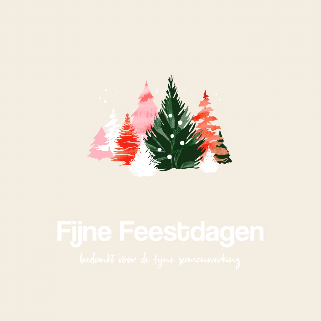 Prachtige zakelijke kerstkaart voor je personeel en zakelijke relaties om ze te bedanken voor de fijne samenwerking het afgelopen jaar. Op deze kaart kerstbomen in verschillende aquarel kleuren. Deze kaart is extra speciaal door het gebruik van écht goudfolie. Dat geeft een luxe uitstraling aan de kaart.