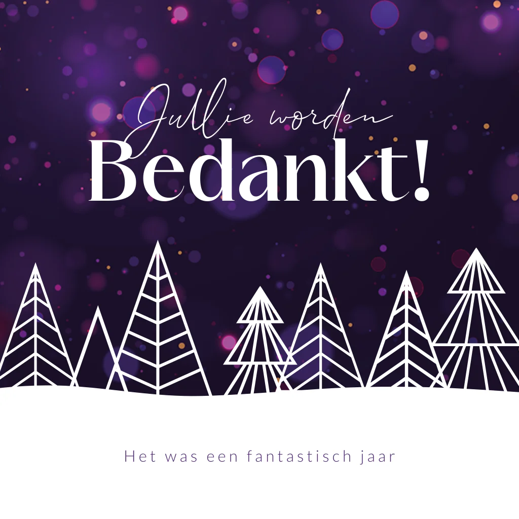 Stijlvolle zakelijke kerstkaart met de tekst "Jullie worden bedankt!". Geschikt voor bedrijven uit diverse sectoren en branches. Op deze kerstkaart zie je strakke geïllustreerde kerstbomen met een paarse achtergrond met sparkles. De holografische foliedruk geeft deze zakelijke kerstkaart een extra vleugje luxe. De gehele kerstkaart is naar eigen wens aan te passen in onze online editor. Hulp nodig? We helpen je graag!