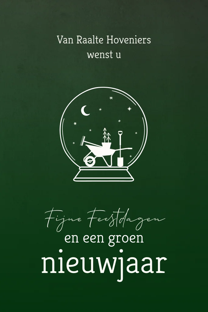 Wens je klanten fijne feestdagen en een groen nieuw jaar met deze zakelijke kerstkaart met foliedruk. Op deze kaart een sneeuwbol. In de snowglobe een kruiwagen met tuingereedschap met op de achtergrond de maan en sterren. Er is gebruik gemaakt van verschillende lettertypes en echt goudfolie, wat de kaart een luxe uitstraling geeft. Deze kaart is geschikt voor bedrijven in de sector groen en natuur zoals een hovenier. Teksten en kleuren zijn makkelijk aan te passen in onze editor. Opmaakhulp nodig? Wij helpen je graag.