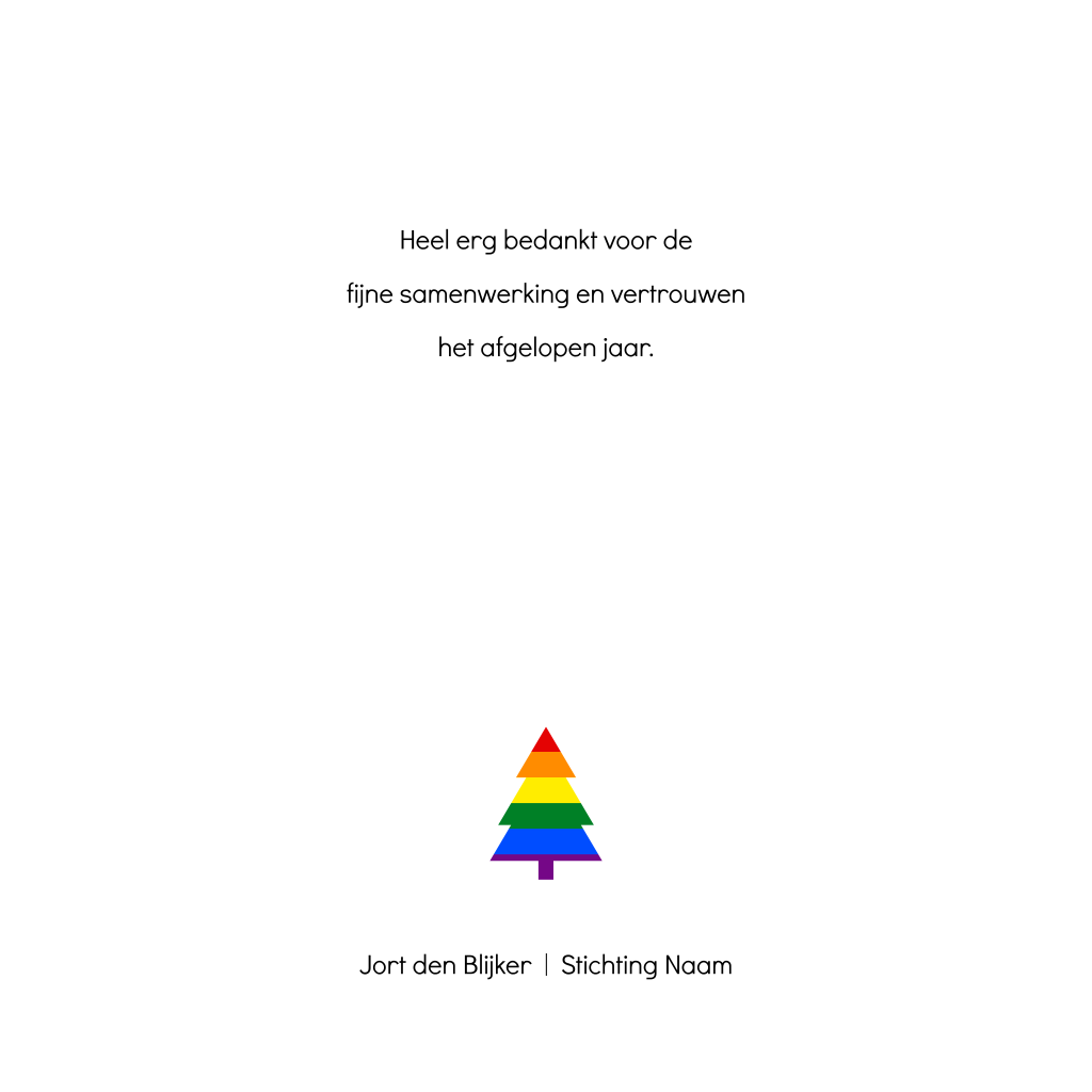 Strakke Pride kerstkaart met écht foliedruk en kleuren van de LHBTI-gemeenschap. Wens je zakelijke relaties, medewerkers en klanten a Pride New Year and Merry Christmas. Uniek aan deze zakelijke kerstkaart is het gebruik van écht goudfolie. Dat geeft deze kerstkaart een luxe uitstraling. Geschikt voor bedrijven uit diverse sectoren en branches.