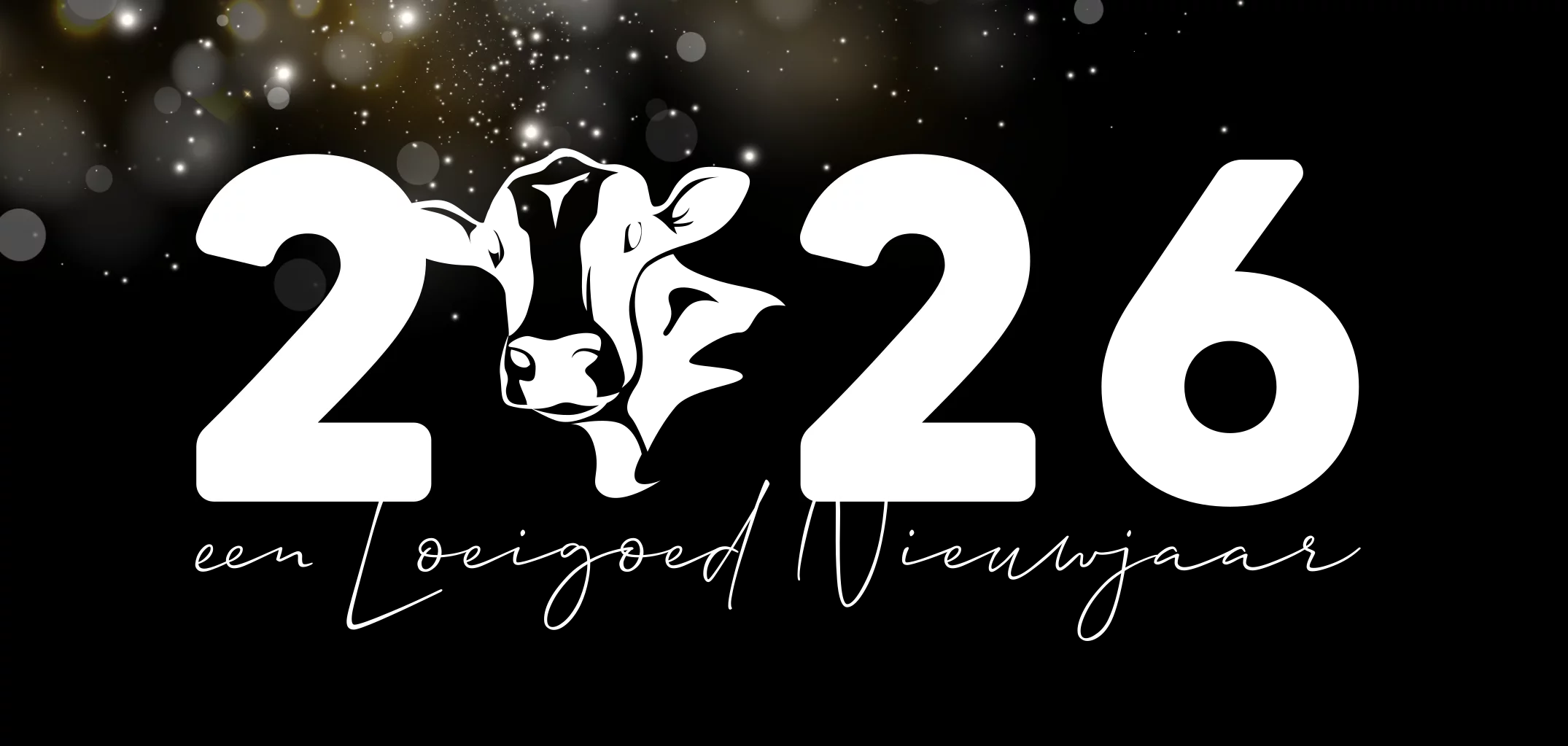 Zakelijke kerstkaart voor een agrarisch bedrijf, zoals een melkveebedrijf of boerderij winkel. Op deze kerstkaart een zwarte achtergrond met het jaartal 2026 met het hoofd van een koe en de toepasselijke tekst 'een Loeigoed Nieuwjaar'. De goudfolie geeft een luxe uitstraling aan deze kerstkaart.