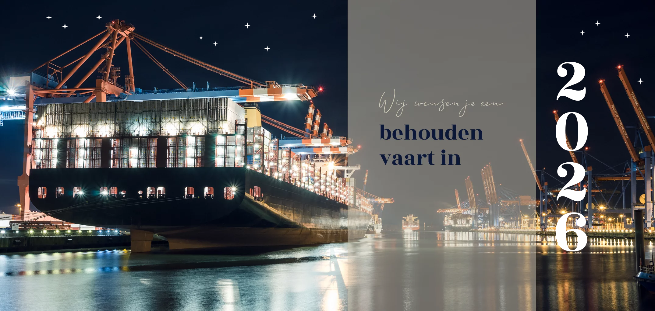 Strakke maritiem kerstkaart met goudfolie. Op deze zakelijke kerstkaart zie je een foto van een containerschip, perfect voor bedrijven die zich richten op de zeevaart, scheepvaart en binnenwateren, zoals schepen, havens, en de bijbehorende techniek en handel. De goudfolie geeft een mooie glans. Pas de kaart eenvoudig aan in de editor.