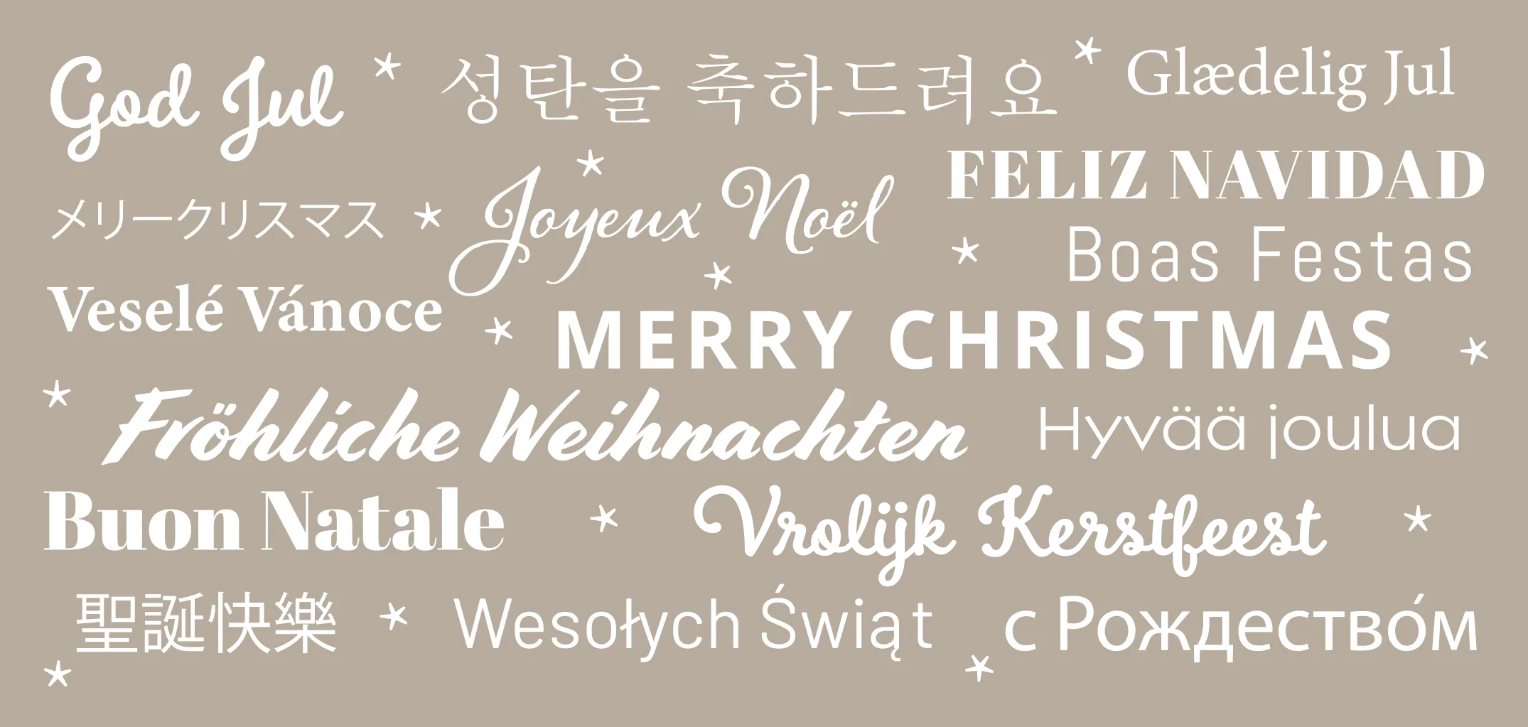 Zakelijke kerstkaart met de kerstboodschap vrolijk kerstfeest in verschillende talen. Geschikt voor bedrijven in de internationale branche. Uniek aan deze kerstkaart is het gebruik van écht foliedruk, namelijk goudfolie. Dat geeft deze kerstkaart een luxe uitstraling.