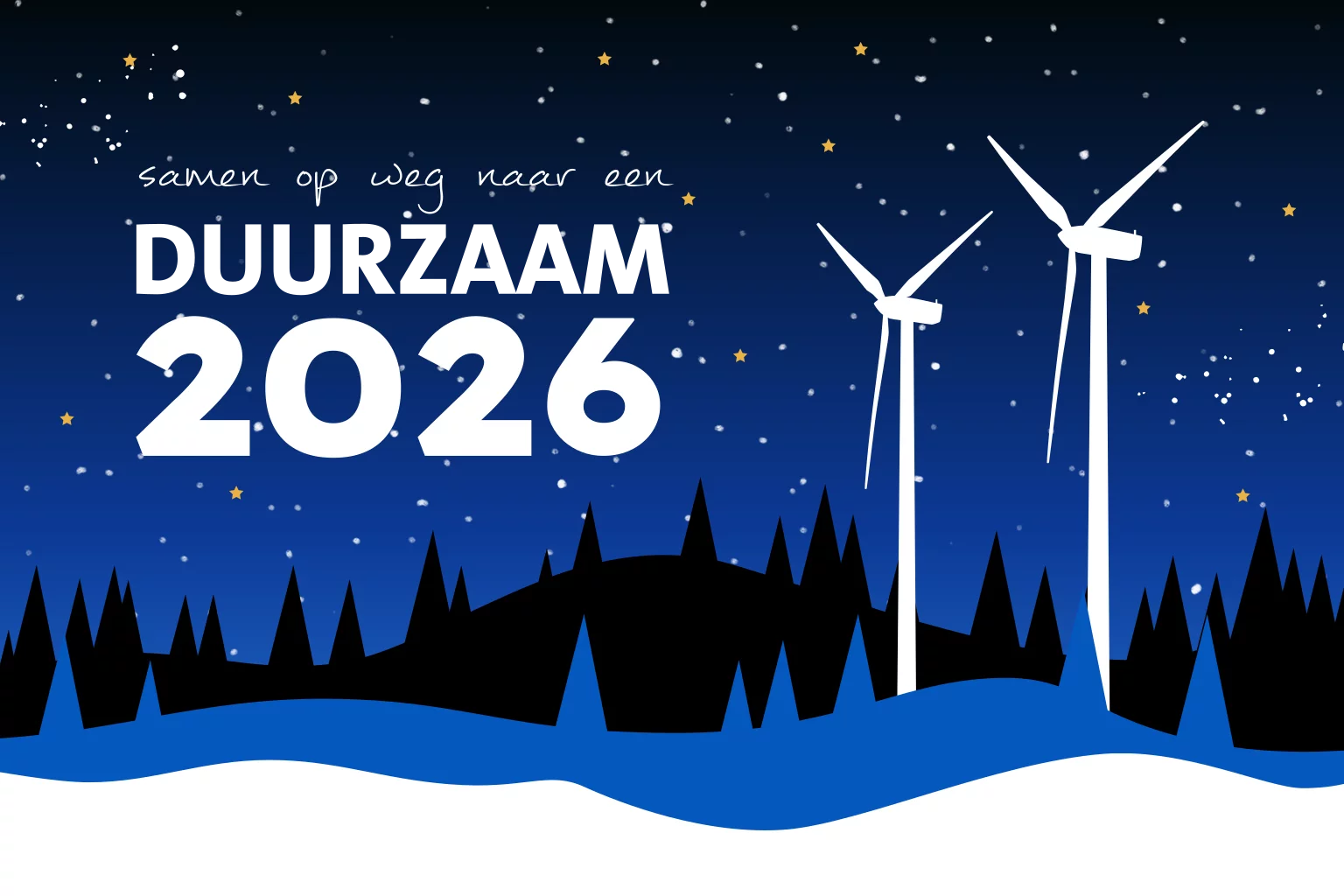 Zakelijke kerstkaart 'Samen op weg naar een duurzaam 2026' met een nachtelijk winterlandschap met windturbines, kerstbomen, sterren en sneeuw. De sterren en het woord 'duurzaam' wordt gedrukt in écht goudfolie. Geschikt voor alle sectoren, maar zeker ook leuk voor de groene sector. Teksten en lettertypes zijn aan te passen in de editor.