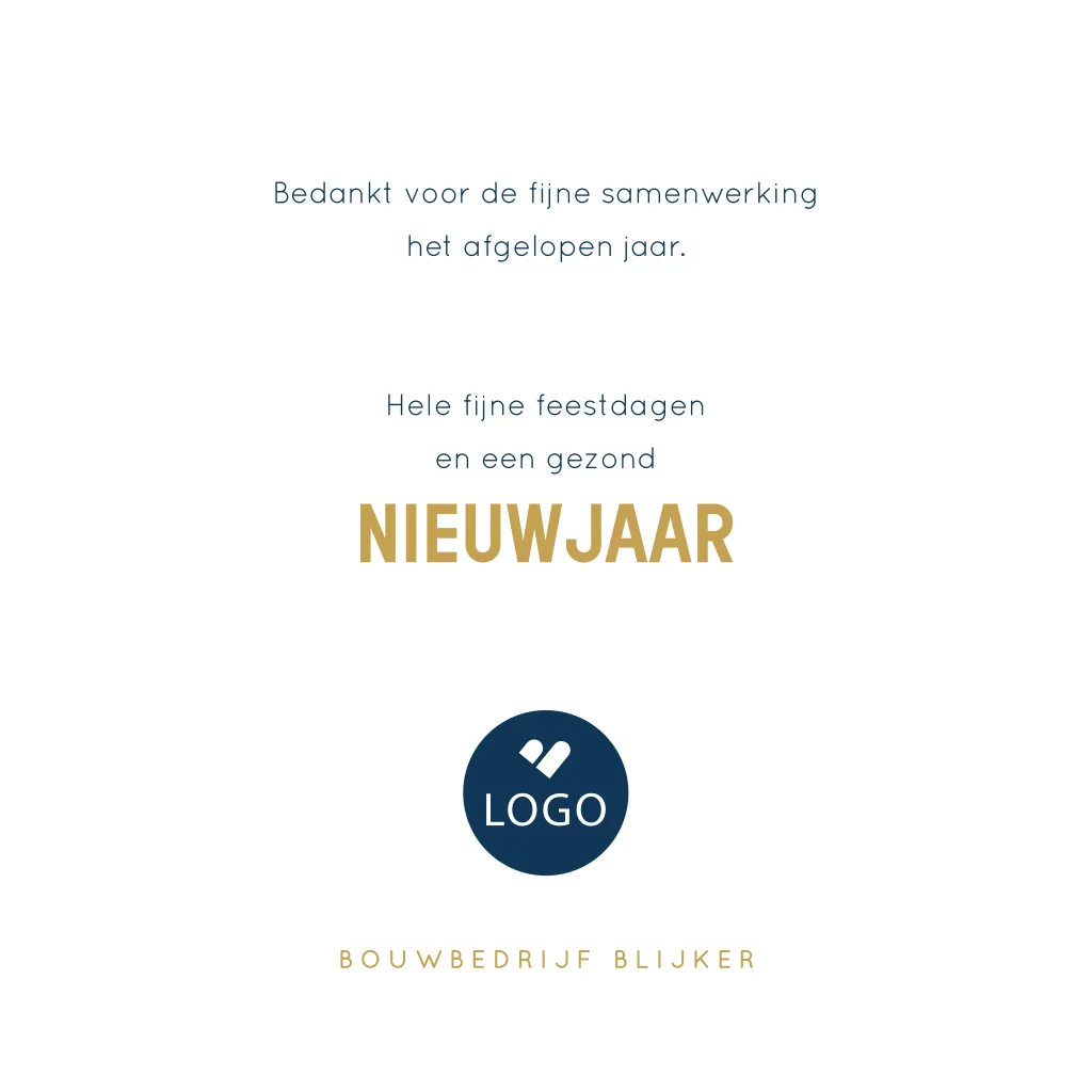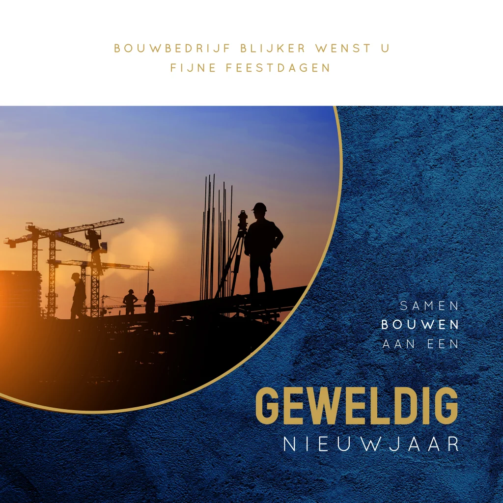Zakelijke kerstkaart met de tekst "samen bouwen aan een geweldig nieuwjaar". Op deze kaart is een foto van een timmerman toegevoegd en deze kan vervangen worden door een eigen foto. Aan de binnenkant is er ruimte voor een bedrijfslogo. Deze kaart heeft een donkerblauwe achtergrond.