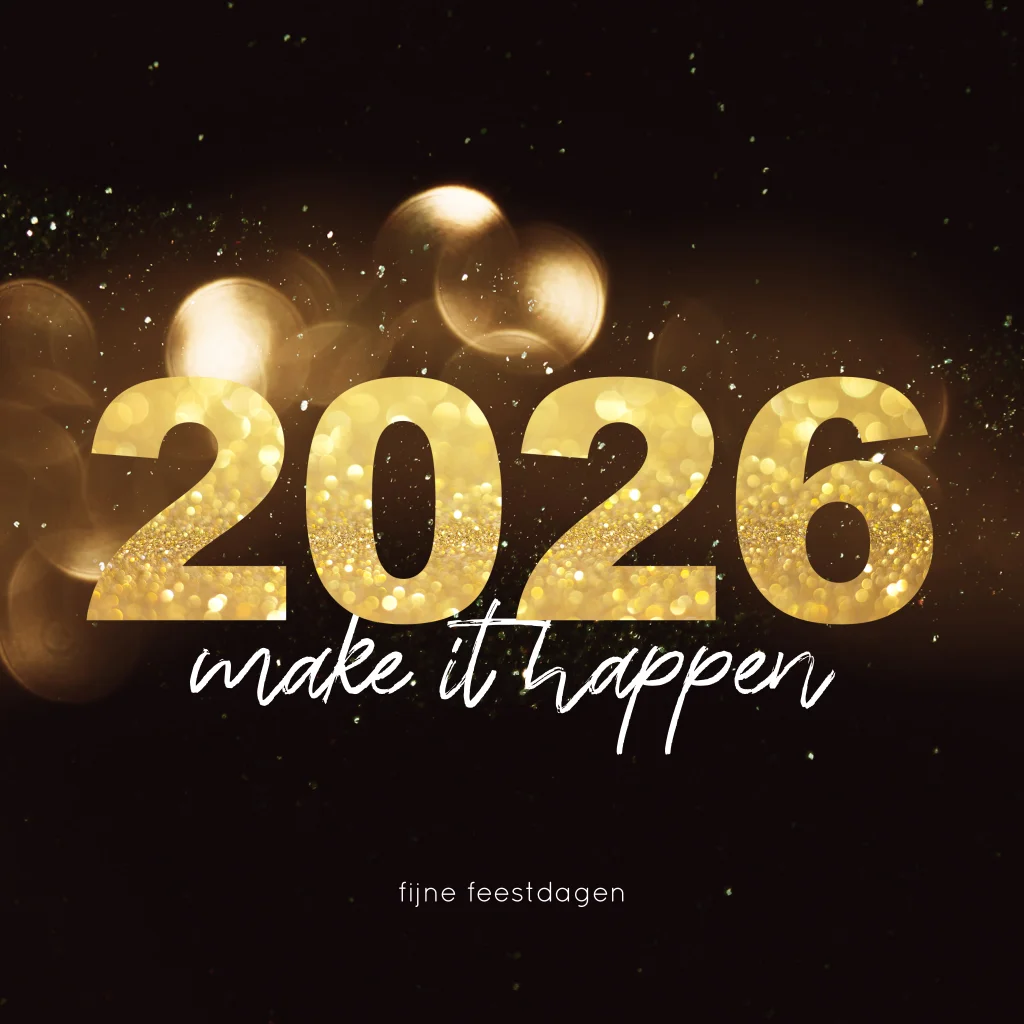 Stijlvolle zakelijke kerstkaart met de tekst "2026 make it happen". Geschikt voor bedrijven uit diverse sectoren en branches. Op deze kerstkaart het jaartal 2026 centraal in mooie goudkleurige cijfers. De witte spetters en gouden, ronde vormen voor de donkere achtergrond geven een feestelijk effect. Op deze kaart is het mogelijk om op de binnenzijde een eigen bedrijfslogo toe te voegen. Deze kaart is voor alle branches en sectoren geschikt. Hulp nodig bij het aanpassen van deze kaart? We helpen je graag!