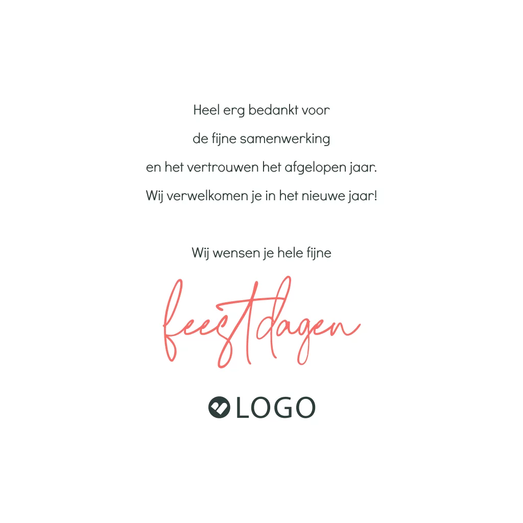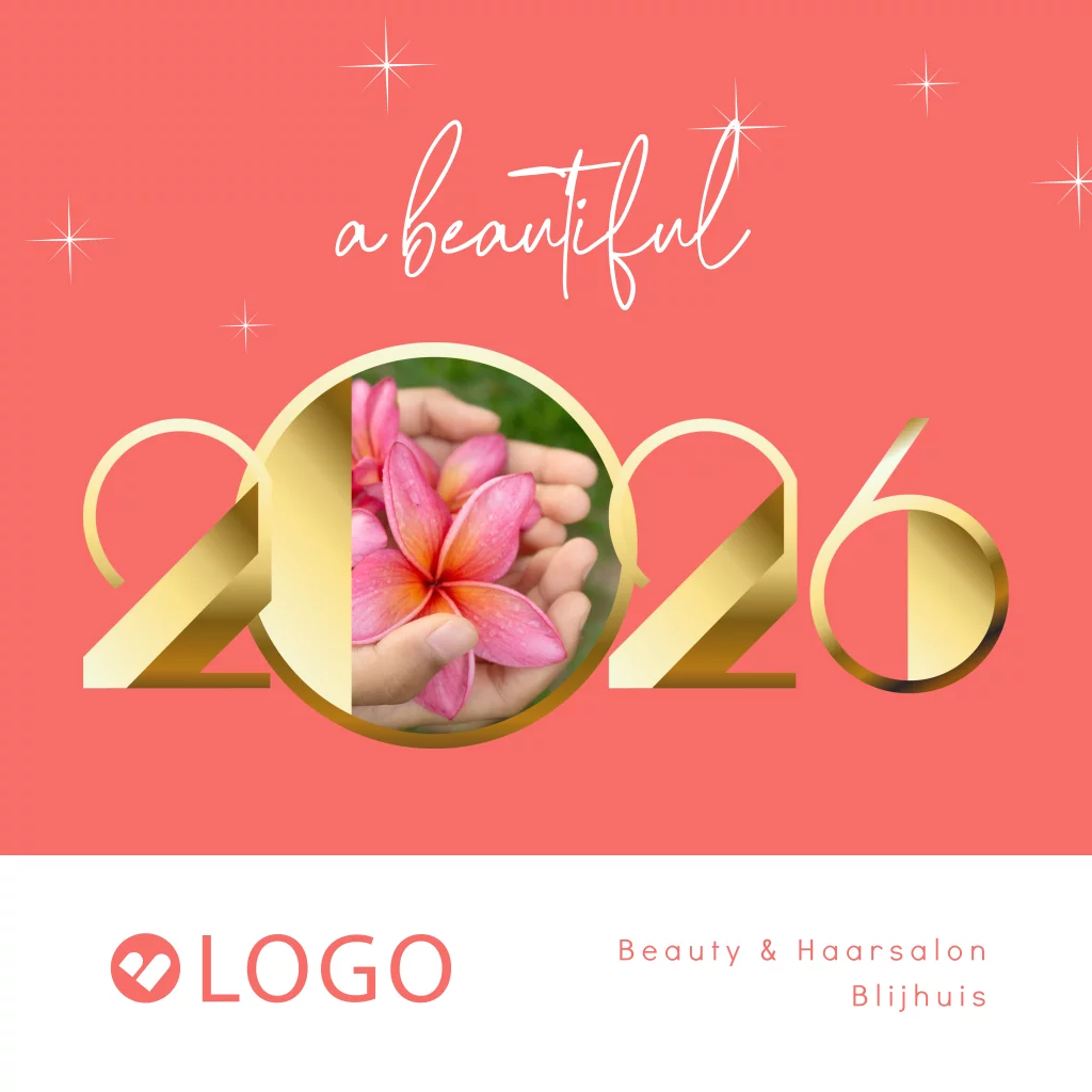 Prachtige zakelijke kerstkaart in een koraalroze kleur met de tekst 'a beautiful 2026'. Het jaartal heeft een mooie goudlook waardoor deze er extra uitspringt. Deze zakelijke nieuwjaarskaart is perfect voor bedrijven in de beauty en welness branche. In het jaartal 2026 staat een sfeerfoto. Deze is ook te vervangen voor een eigen bedrijfsfoto. Op de voorzijde is ruimte voor je eigen bedrijfslogo. Teksten, kleuren en lettertypes zijn aan te passen in onze ontwerpmodule. Kom je er zelf niet uit? We helpen je graag!