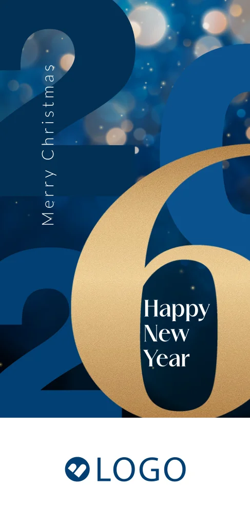 Stijlvolle zakelijke kerstkaart met jaartal, sparkles en logo