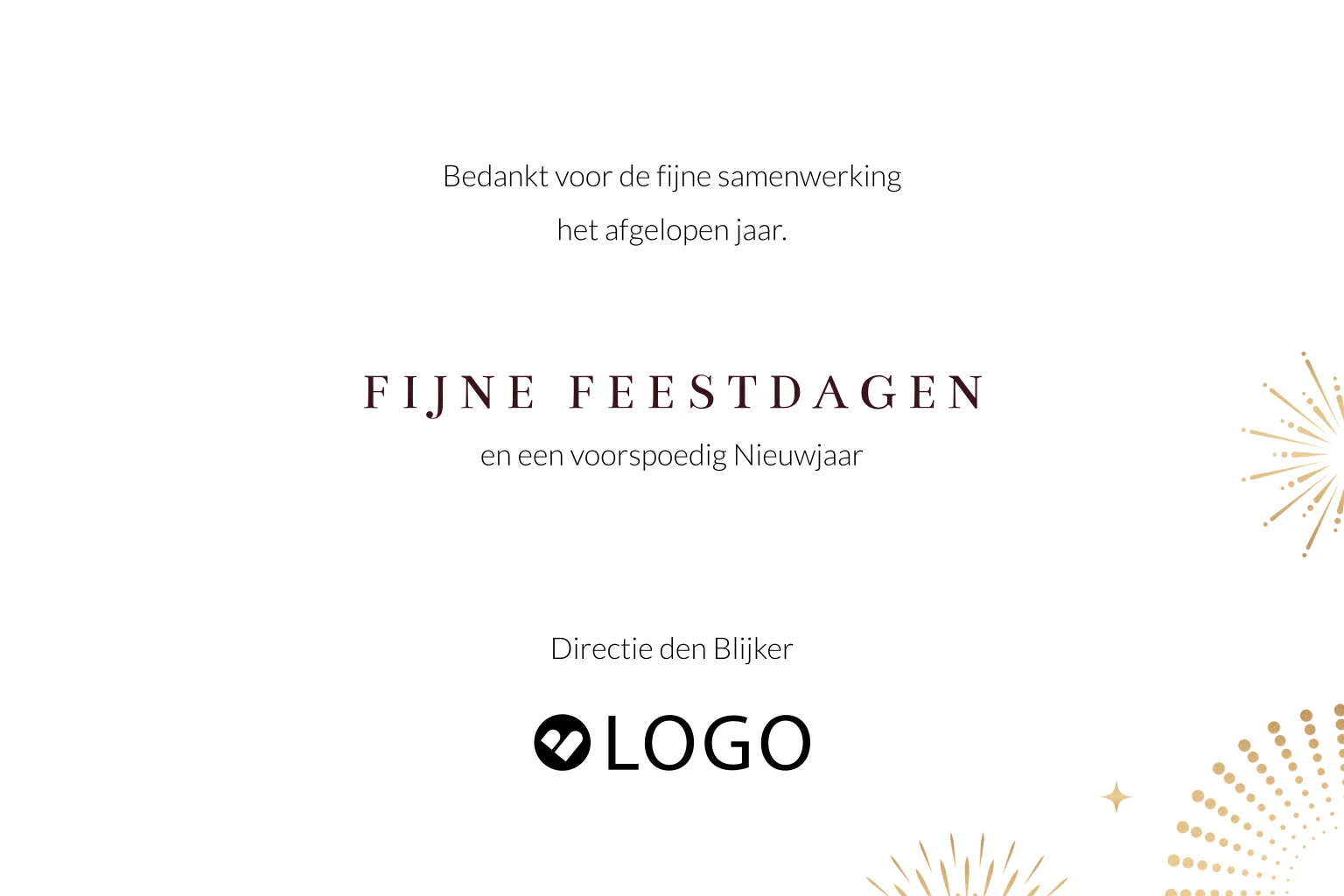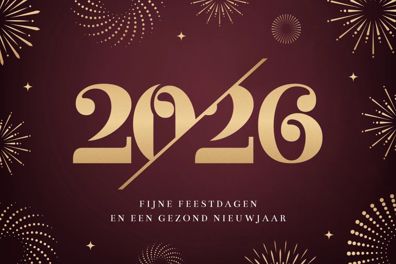 Een stijlvolle zakelijke kerstkaart, geschikt voor meerdere branches. Op deze kerstkaart zie je het jaartal 2026 in goudlook staan met de tekst Fijne feestdagen en een gezond nieuwjaar'. De achtergrond met gouden sterren en vuurwerk zorgen voor ene feestelijk geheel. Kleuren, lettertypes en illustraties zijn naar eigen wens aan te passen in de editor. Voeg een eigen bedrijfslogo in de binnenzijde toe voor de persoonlijke touch.