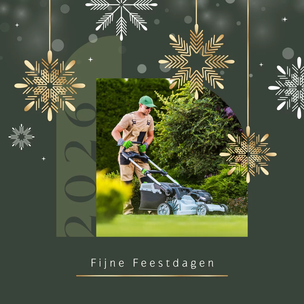 Een mooi zakelijke kerstkaart voor de natuur en groen branche. Op de voorzijde van deze kaart zie je een foto van een hovenier, het jaartal 2026, ijskristallen en de tekst 'Fijne feestdagen staan'. Pas deze kaart naar eigen wens aan in onze online editor. In de binnenzijde van deze kaart kun je je eigen bedrijfslogo plaatsen. Kom je er niet helemaal uit met het ontwerpen? Neem dan gerust contact met ons op en dan helpen we je graag verder.