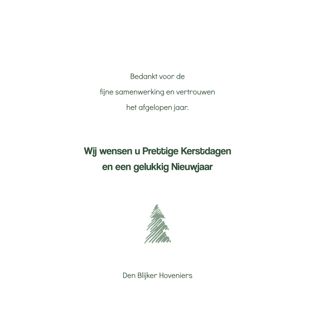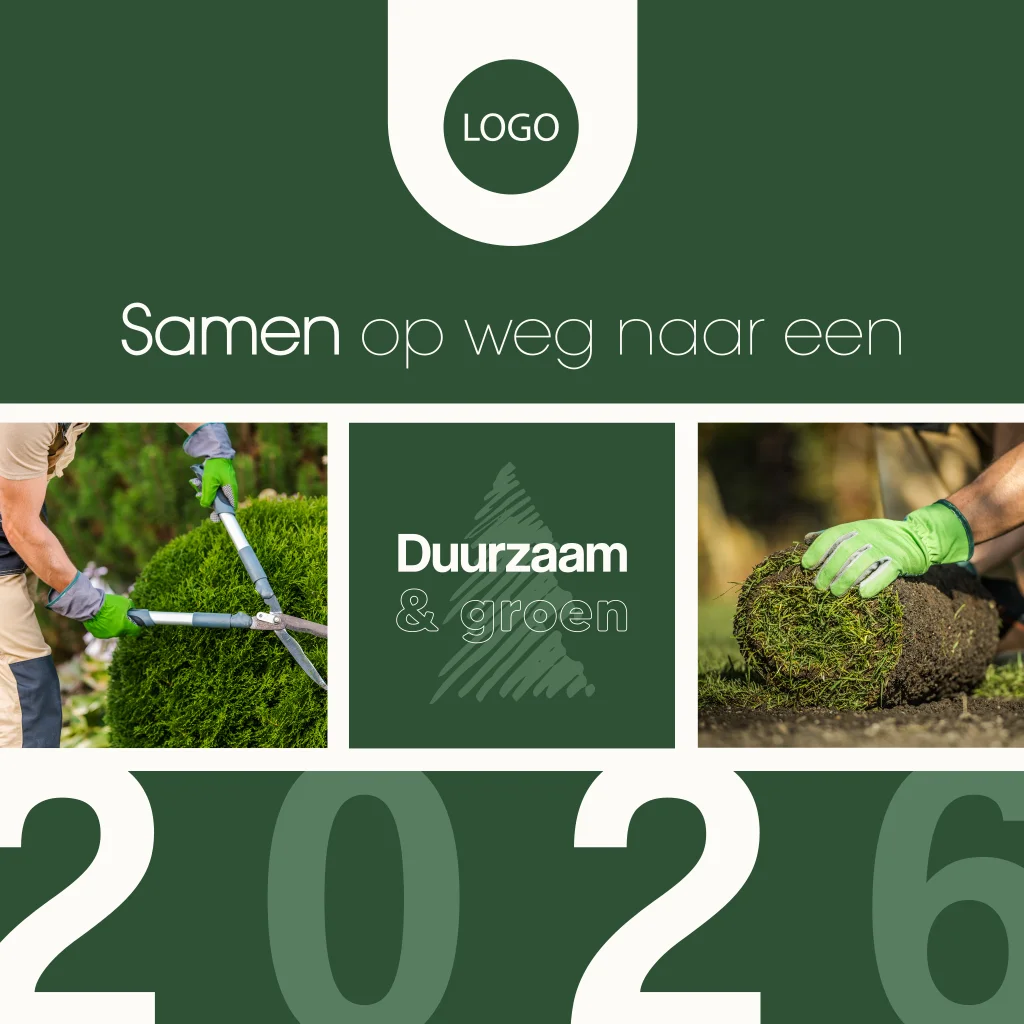 Samen op weg naar een duurzaam 2026. Wens je klanten prettige kerstdagen en een Gelukkig Nieuwjaar met deze mooie zakelijke kerstkaart, speciaal voor een bedrijf in de sector natuur en groen zoals een Hoveniersbedrijf. Op deze kaart verschillende groene vlakken met sfeerfoto's en het jaartal 2026.