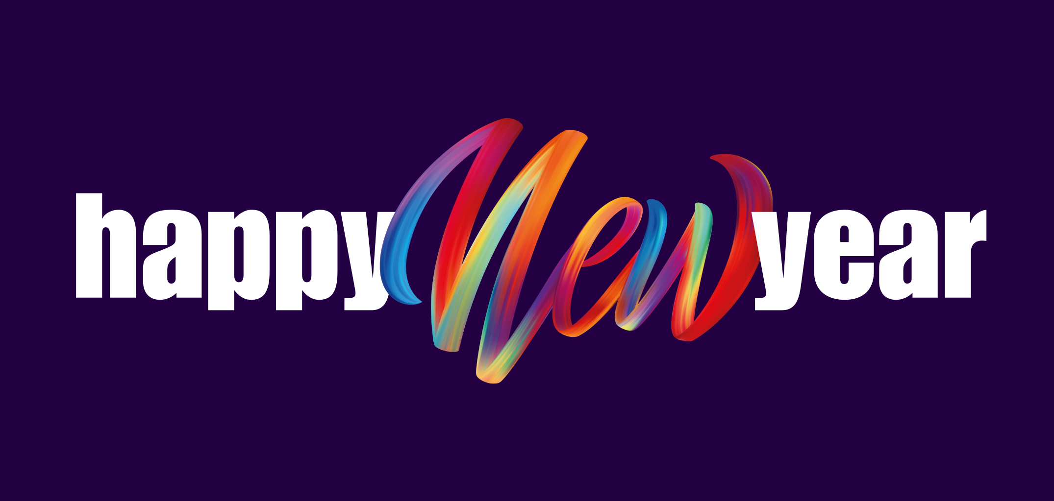 Wens jouw medewerkers, klanten of cliënten fijne feestdagen en een Gelukkig Nieuwjaar. Op deze kaart de tekst 'happy new year' met gekleurde penseelstreken. Geef kleur aan het nieuwe jaar met deze vrolijke zakelijke kerstkaart, speciaal voor een schildersbedrijf.
