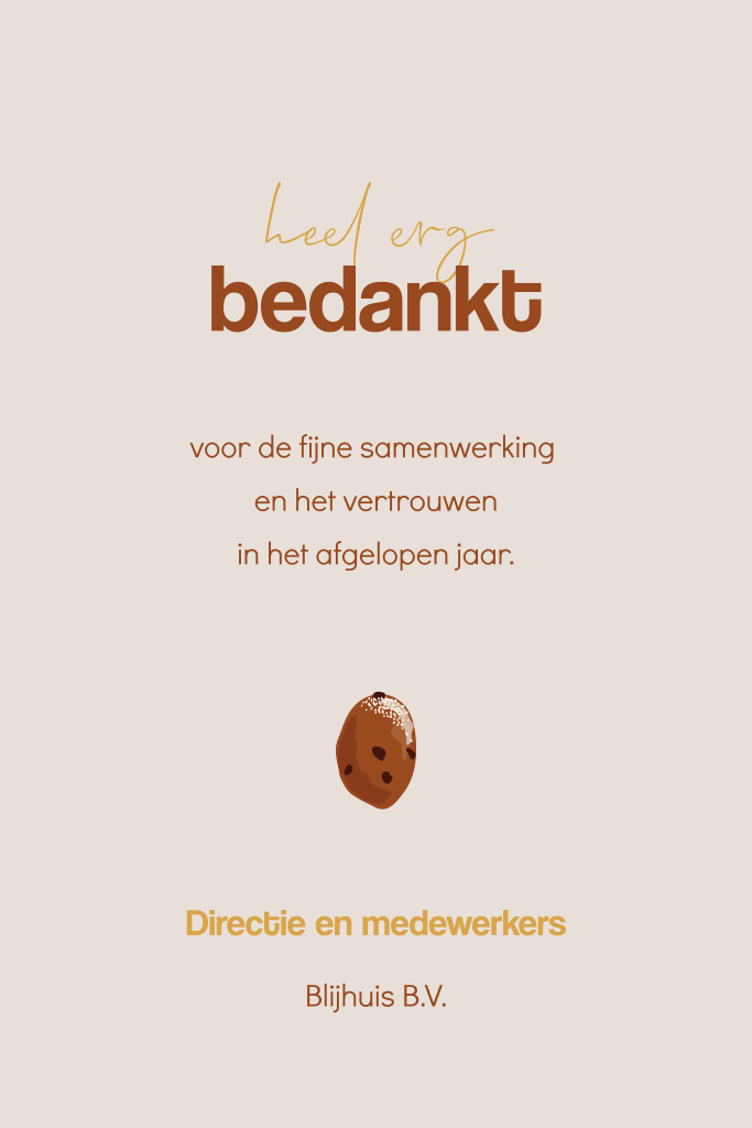 Wens je medewerkers, klanten en zakelijke relaties een Merry kerstmuts and a happy oliebol! Op deze beige zakelijke nieuwjaarskaart een oliebol met poedersuiker. Helemaal passend voor een onvergetelijke jaarwisseling!
