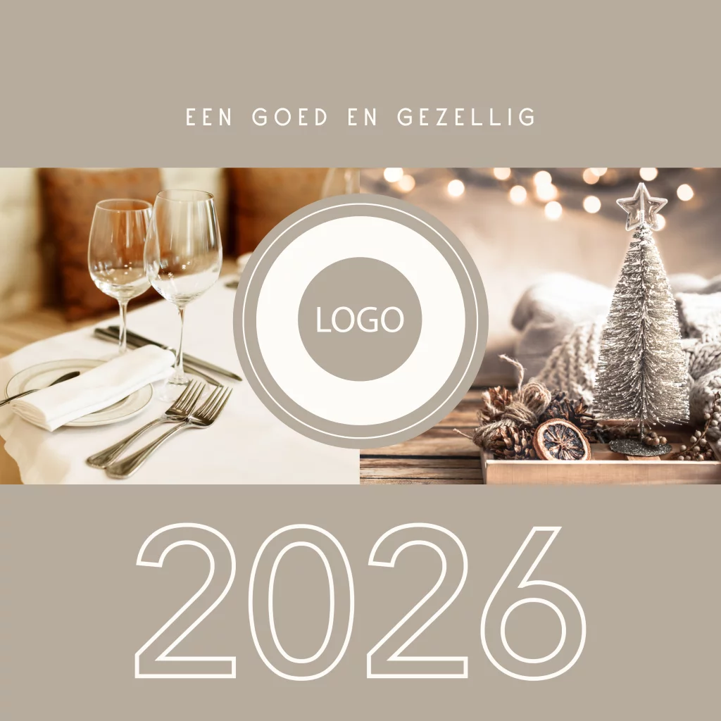 Zakelijke kerstkaart voor o.a. restaurant, horeca bedrijven en entertainment sector. Op deze kaart in zachte beige grijs tinten staan 2 sfeervolle foto's met daartussen ruimte om een eigen bedrijfslogo toe te voegen. Het jaartal staat in een outline lettertype geschreven. Wil je de kaart nóg persoonlijker maken, dan zijn de gebruikte foto's ook te vervangen door eigen bedrijfsfoto's. We helpen je graag bij het aanpassen van deze kaart, geheel naar je eigen smaak.