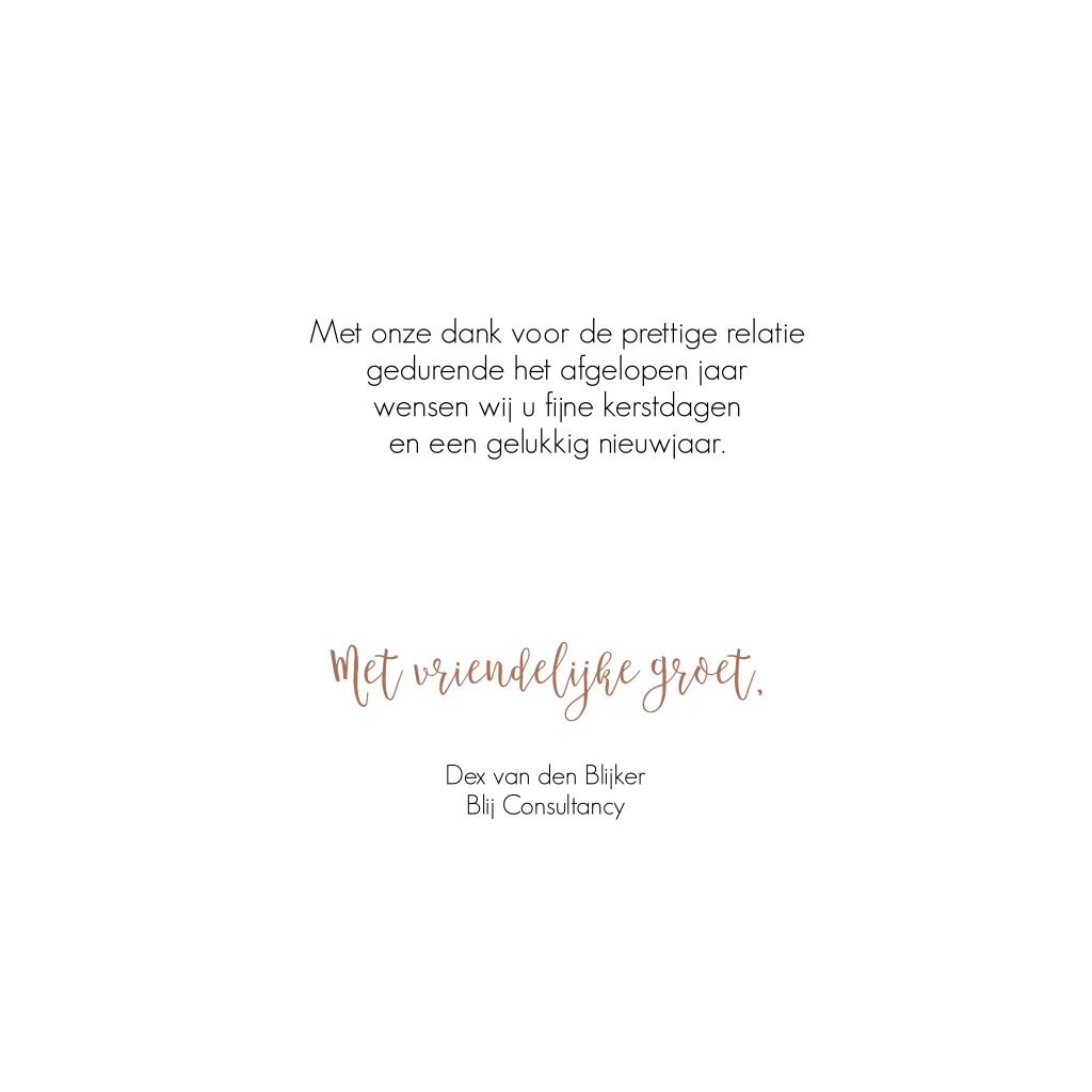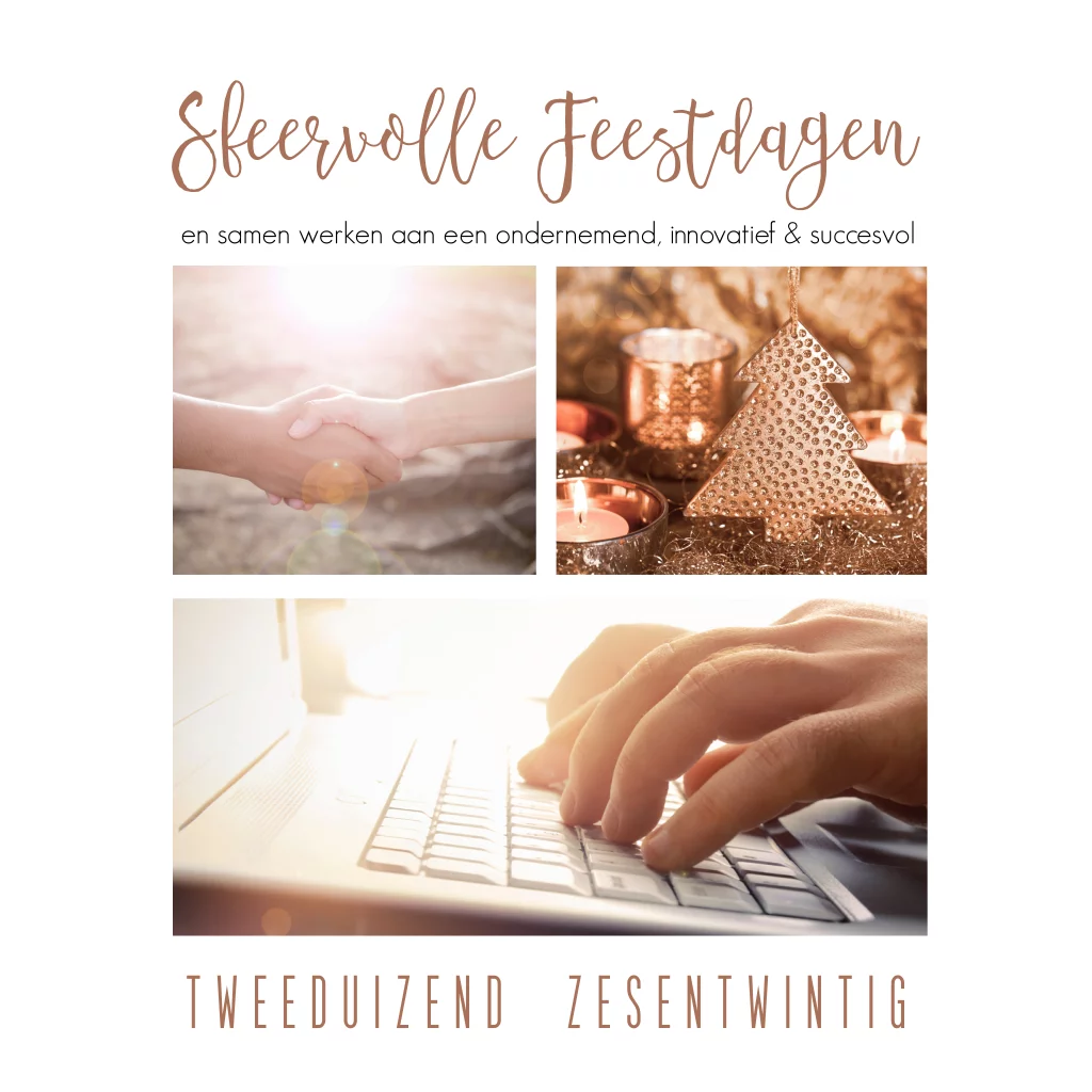 Zakelijke kerstkaart voor een ICT bedrijf of de zakelijke dienstverlening met sfeervolle foto's. Op de gebruikte foto's staan een kerstboom hanger in zachte rose tinten, een handdruk tussen twee mensen en een computer toetsenbord. De foto' s zijn ook aan te passen naar persoonlijke bedrijfsfoto's. Op deze manier is deze kaart aan te passen naar elke sector. Het ontwerpteam van Blijkaartje helpt je graag met het aanpassen van de kaart.
