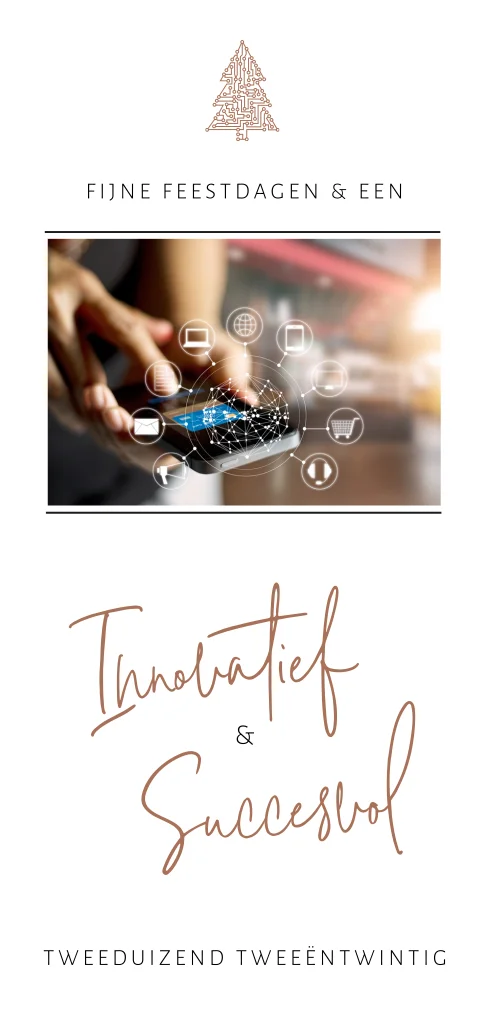 Zakelijke kerstkaart voor onder andere de ICT en zakelijke dienstverlening. Op deze kaart staat een foto met een mobiel device en verschillende icoontjes zoals een website, computer, winkelwagen en email. Heb je een bedrijf welke is gespecialiseerd in het verwerken van big data, dan is deze zakelijke kaart super geschikt. Op de achterkant van de kaart is er voldoende ruimte voor een persoonlijke tekst of bedrijfslogo.