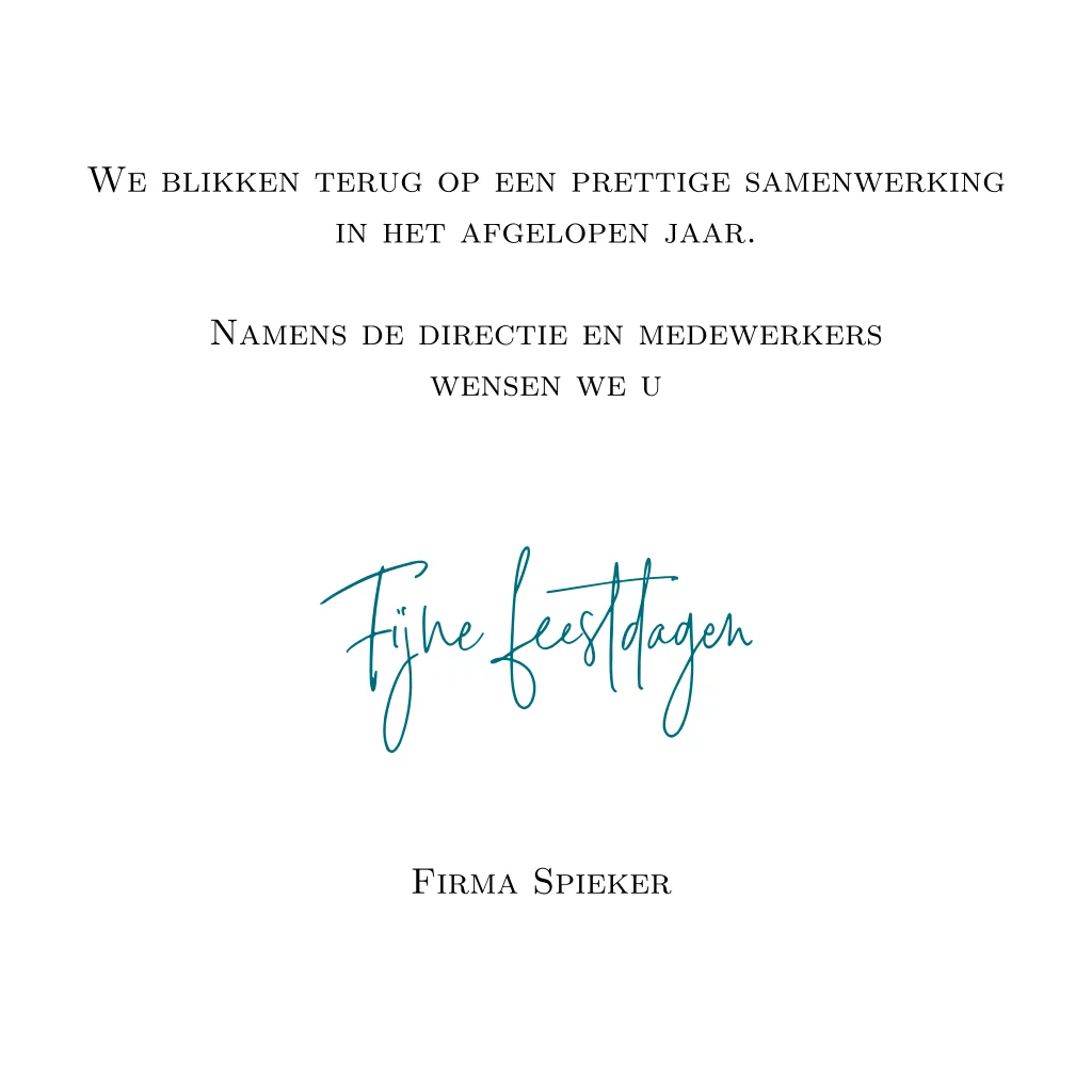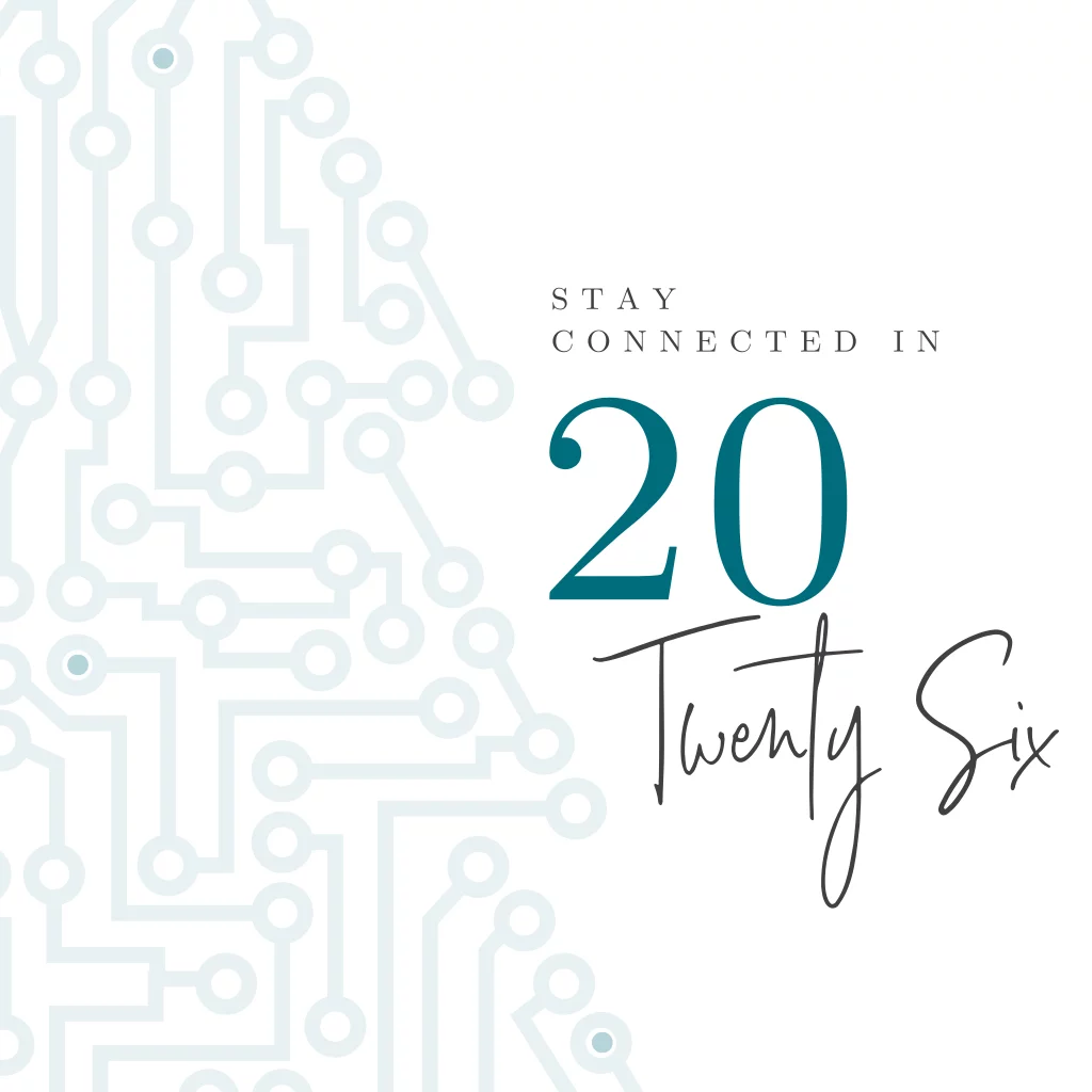 Hippe zakelijke kerstkaart voor o.a. de ICT sector of zakelijke dienstverlening. Met een kerstboom die bestaat uit verbindingen en een jaartal. Het jaartal staat op een speelse manier geschreven. De tekst we stay connected staat op de voorkant. Op de binnenzijde is ruimte voor het bedrijfslogo.