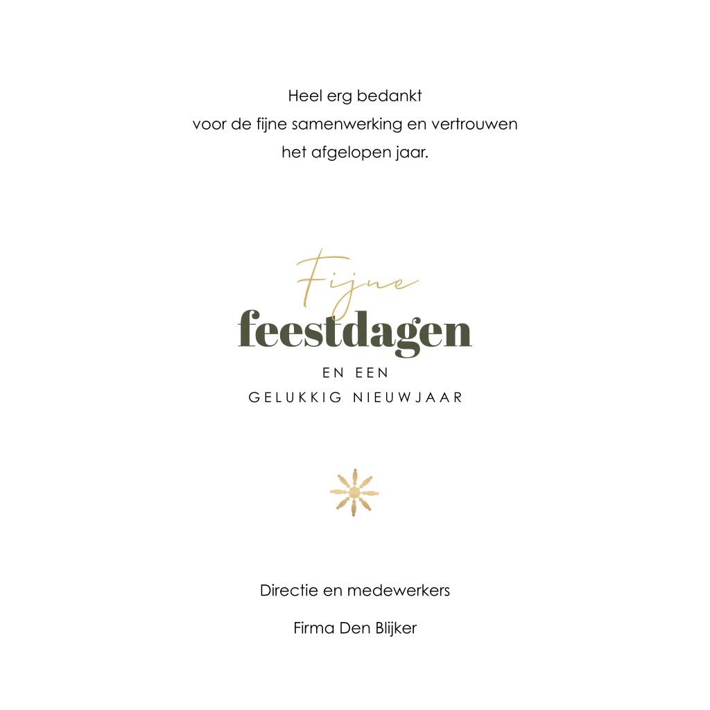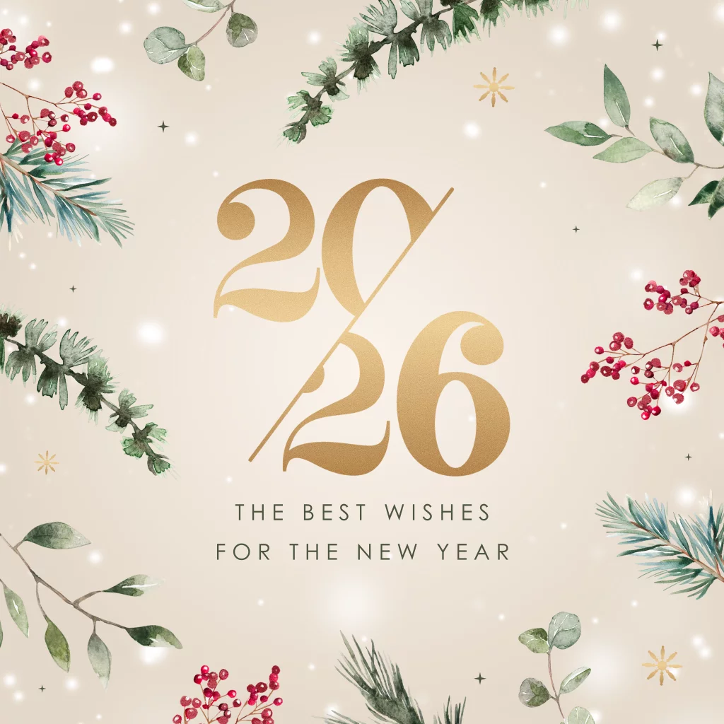 Een prachtige zakelijke kerstkaart met een goudlook jaartal. Op deze kaart zie je verschillende kersttakken, een beige achtergrond en fonkelende sterretjes en sneeuwvlokken. Deze kerstkaart is erg leuk om naar je zakelijke relaties en werknemers te sturen.