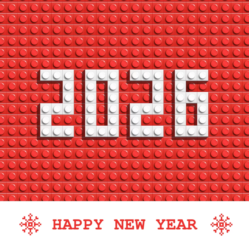 Zakelijke nieuwjaarskaart voor o.a. de bouw of techniek sector met lego bouwstenen en sneeuwvlokken. De kaart heeft typische kerstkleuren, namelijk rood en wit. Wens je medewerkers en zakelijke relaties een Happy New Year en bedank ze met deze zakelijke kaart gelijk voor het afgelopen jaar. Pas de kerstkaart naar je eigen smaak aan in de editor. Hulp nodig hierbij? We helpen je graag.