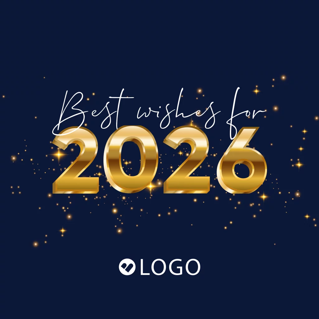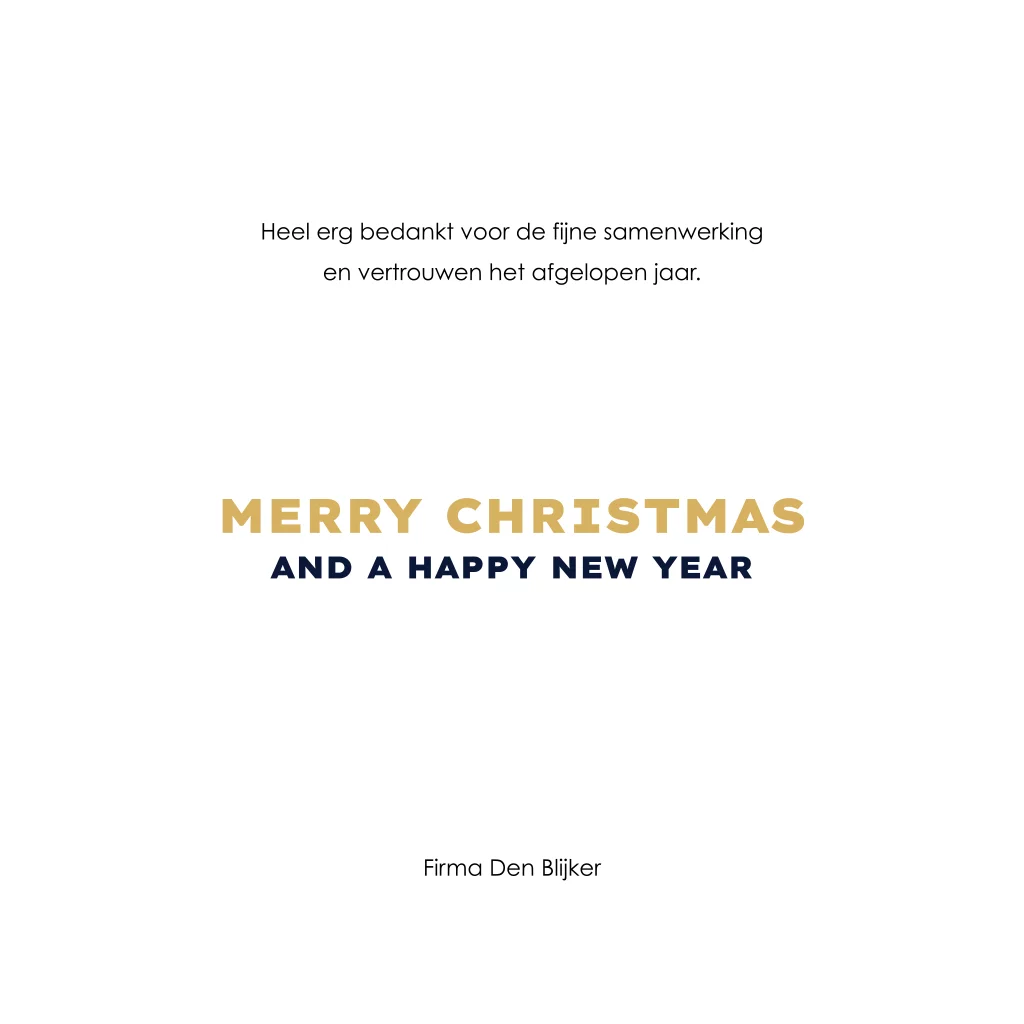 Best wishes for 2026! Met de beste wensen voor een fijne kerst en een gelukkig nieuwjaar, is deze zakelijke kerstkaart een perfecte manier om je waardering te tonen aan je medewerkers en zakelijke relaties. Deze donkerblauwe kerstkaart met gouden sparkles is geschikt voor bedrijven uit diverse sectoren en branches. Voeg een eigen bedrijfslogo op de voorkant van deze kerstkaart toe voor een persoonlijke touch. Pas deze kaart naar eigen wens aan in onze online editor.