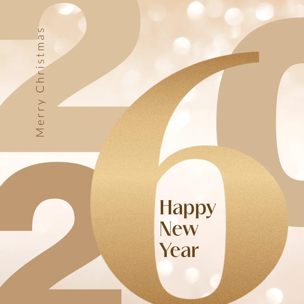 Vier de feestdagen in stijl met deze prachtige typografische zakelijke kerstkaart met goudlook. Deze kerstkaart is geschikt voor bedrijven uit diverse sectoren en branches. Het jaartal 2026 staat opvallend centraal in goudkleurige cijfers. Bewerk deze kerstkaart naar eigen wens in onze online editor. Kom je er niet uit? We helpen je graag!