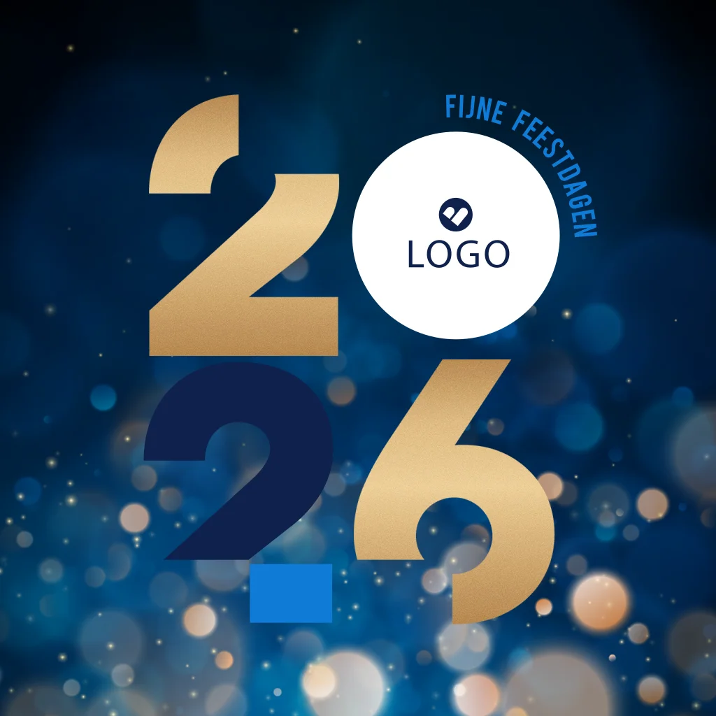 Vier de feestdagen in stijl met deze stijlvolle zakelijke kerstkaart. Deze kerstkaart heeft een donkerblauwe achtergrond met goudlook getallen en sparkles. De kerstkaart is geschikt voor bedrijven uit diverse sectoren en branches. Het jaartal 2026 staat opvallend centraal in blauwe en gouden getallen. Het cijfer nul is vormgegeven met plek voor een eigen bedrijfslogo. Bewerk deze kerstkaart naar eigen wens in onze online editor. Kom je er niet uit? We helpen je graag!