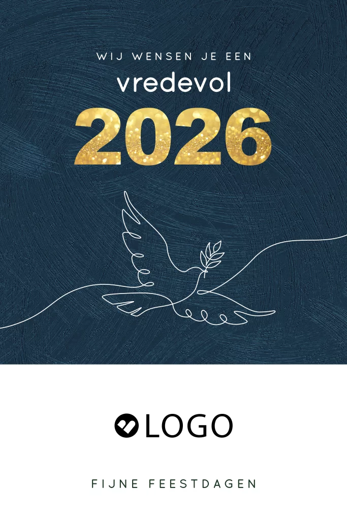 Zakelijke kerstkaart om je medewerkers of klanten fijne feestdagen en een vredevol 2026 toe te wensen. Op deze kaart staat het jaartal 2026 in goudkleurige cijfers en een mooie lijntekening van een vliegende duif met takje in de bek. Het is mogelijk op de voorzijde je eigen bedrijfslogo toe te voegen.