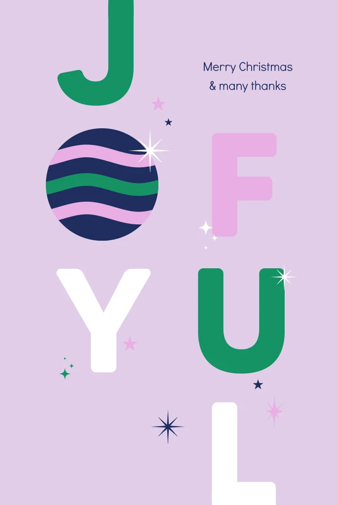 Bedank je fantastische medewerkers voor het afgelopen jaar en wens ze fijne feestdagen met deze mooie zakelijke kerstkaart. Op deze kaart de kleurrijke tekst Joyful met een kerstbal. Deze hippe kerstkaart is makkelijk aan te passen in onze editor. Zo kun je hem geschikt maken voor elke branche of sector. Hulp nodig? Wij helpen je graag verder.