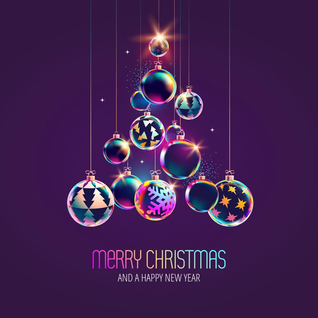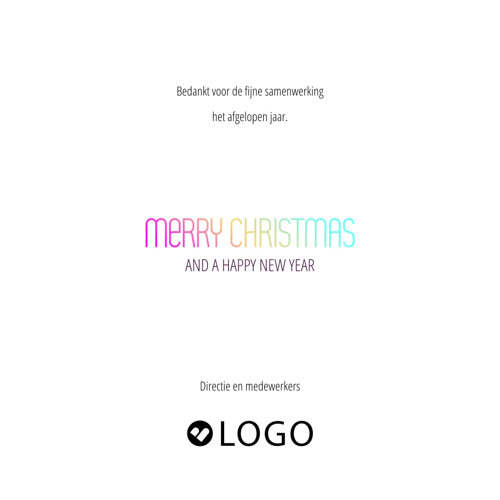 Hippe zakelijke kerstkaart met hangende kerstballen in de vorm van een kerstboom. De kerstballen zijn kleurrijk met een holografische touch. De paarse met neon kleuren maken een mooie kleurencombinatie. Wens je zakelijke relaties een Merry Christmas and a happy New Year! In de binnenzijde van deze kerstkaart kun je je eigen bedrijfslogo plaatsen. Hulp nodig bij het aanpassen van deze kaart? We helpen je graag!