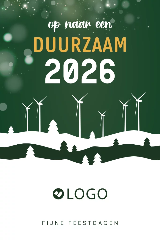 Zakelijke kerstkaart met eigen logo en jaartal. Op zoek naar een unieke zakelijke kerstkaart? Kies dan voor deze zakelijke kerstkaart met een sneeuwlandschap met kerstbomen en windturbines. Perfect voor een bedrijf in de natuur en eco branche zoals een energiebedrijf. Op de voorzijde is ruimte voor een eigen bedrijfslogo zodat je klanten of medewerkers je bedrijf herkennen. Deze kaart is perfect om je klanten of medewerkers fijne feestdagen toe te wensen!