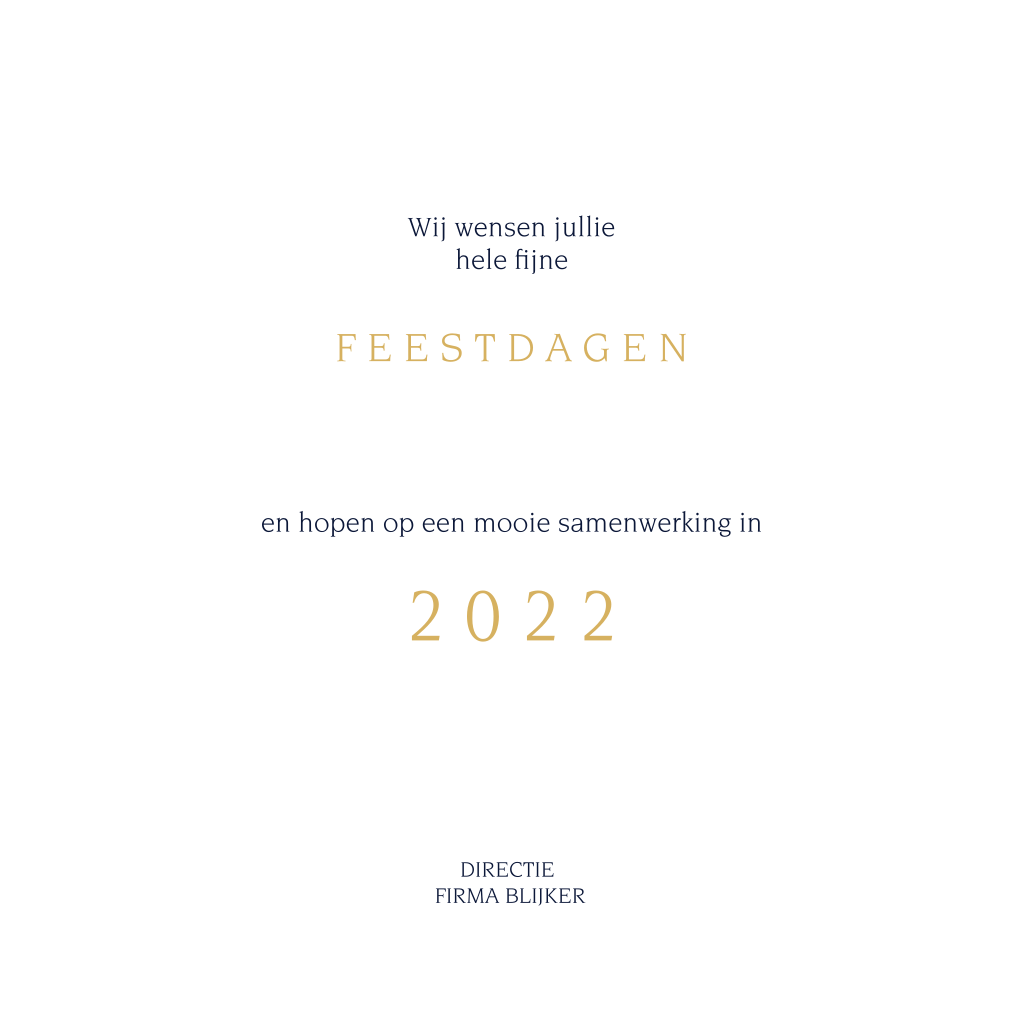 Een mooie zakelijke kerst kaart om klanten of medewerkers fijne feestdagen en een gezond nieuwjaar te wensen. Op deze kaart een kerstboom in gouden blokjes. Op de aquarel achtergrond een stijlvolle donkerblauwe kleur. Teksten, lettertypes en kleuren zijn aan te passen in de editor. Geschikt voor alle branches.
