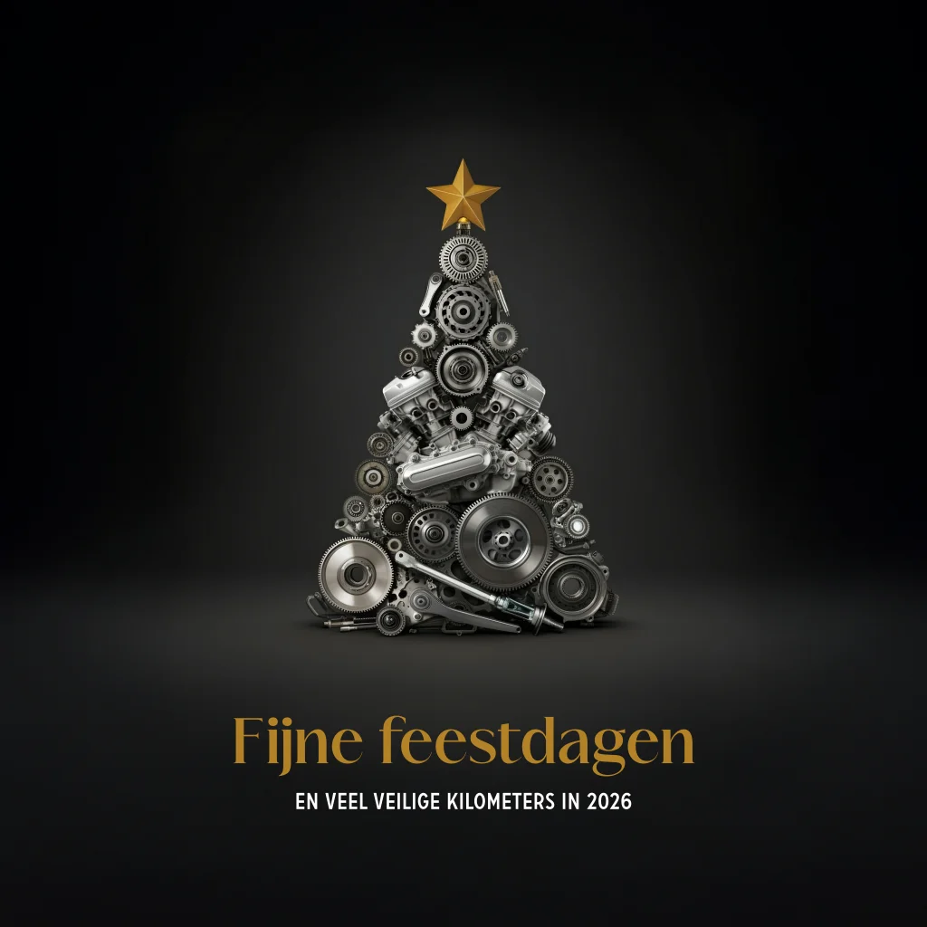 Een stoere zakelijke kerstkaart voor de autobranche. Op deze kaart staat de tekst 'Fijne feestdagen en veel veilige kilometers in 2026' en een illustratie van een kerstboom die bestaat uit auto onderdelen. De gehele kerstkaart is naar eigen wens aan te passen in de editor. Voeg een eigen bedrijfslogo toe aan de binnenzijde voor een persoonlijk tintje. De antiek gouden envelop maakt deze kaart helemaal af.