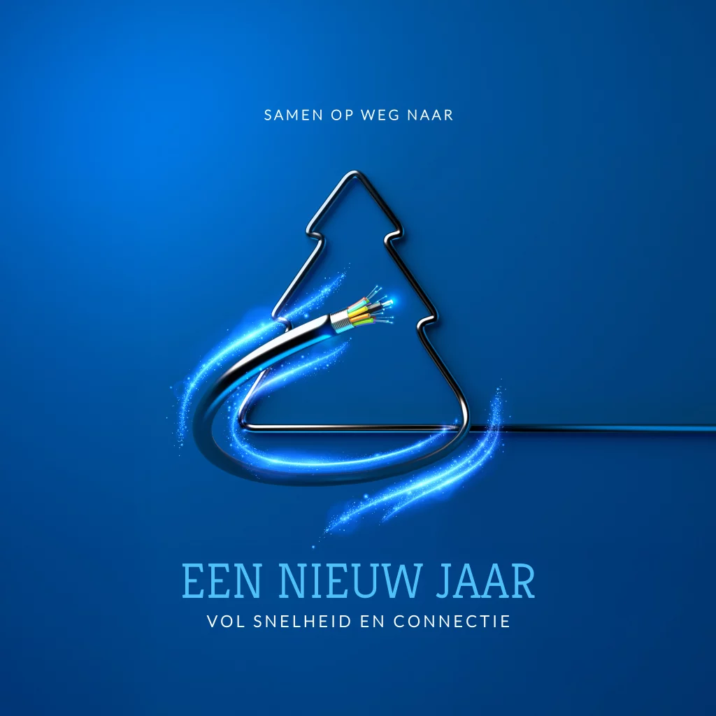 Samen op weg naar een nieuw jaar! Een opvallende zakelijke kerstkaart voor de techniek branche. Op deze kaart zie je een glasvezelkabel in de vorm van een kerstboom. Kleuren, lettertypes en illustraties zijn eenvoudig aan te passen in de editor. Met de donkerblauwe envelopkleur maak je deze kaart helemaal in stijl af.