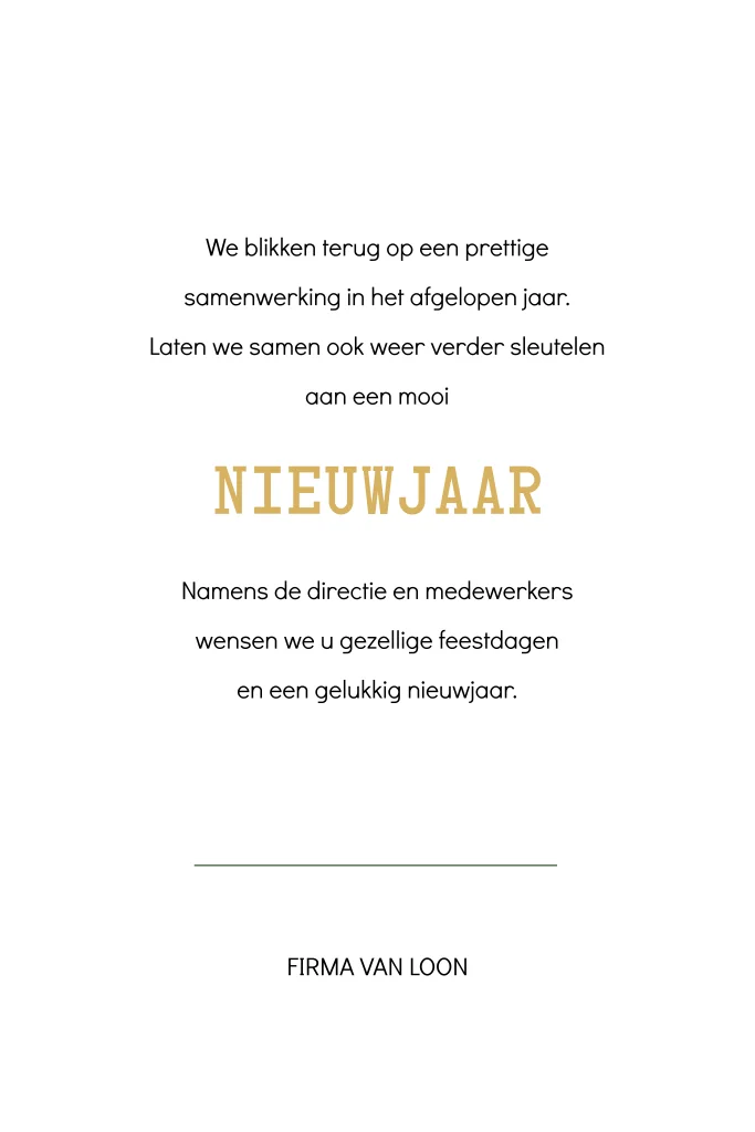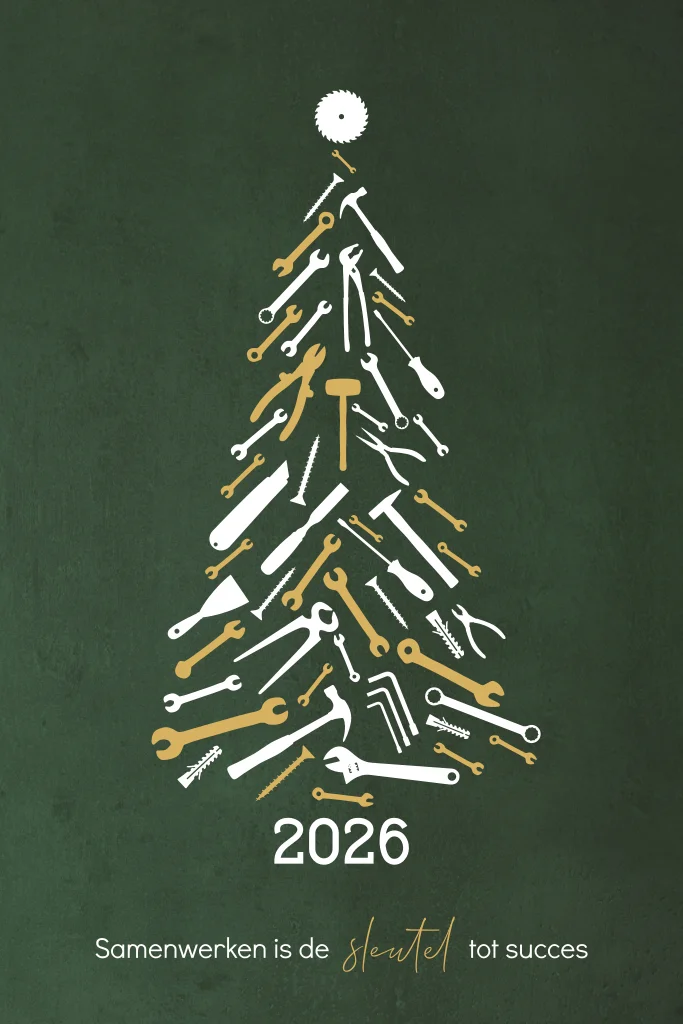 Zakelijke kerstkaart voor o.a. de bouw of techniek sector met een kerstboom die is opgebouwd uit gereedschap. Want "samenwerken is de sleutel tot succes". Onder de kerstboom staat het nieuwe jaartal. Deze kerstkaart pas je naar eigen smaak aan in de editor. Hulp nodig hierbij? We helpen je graag.