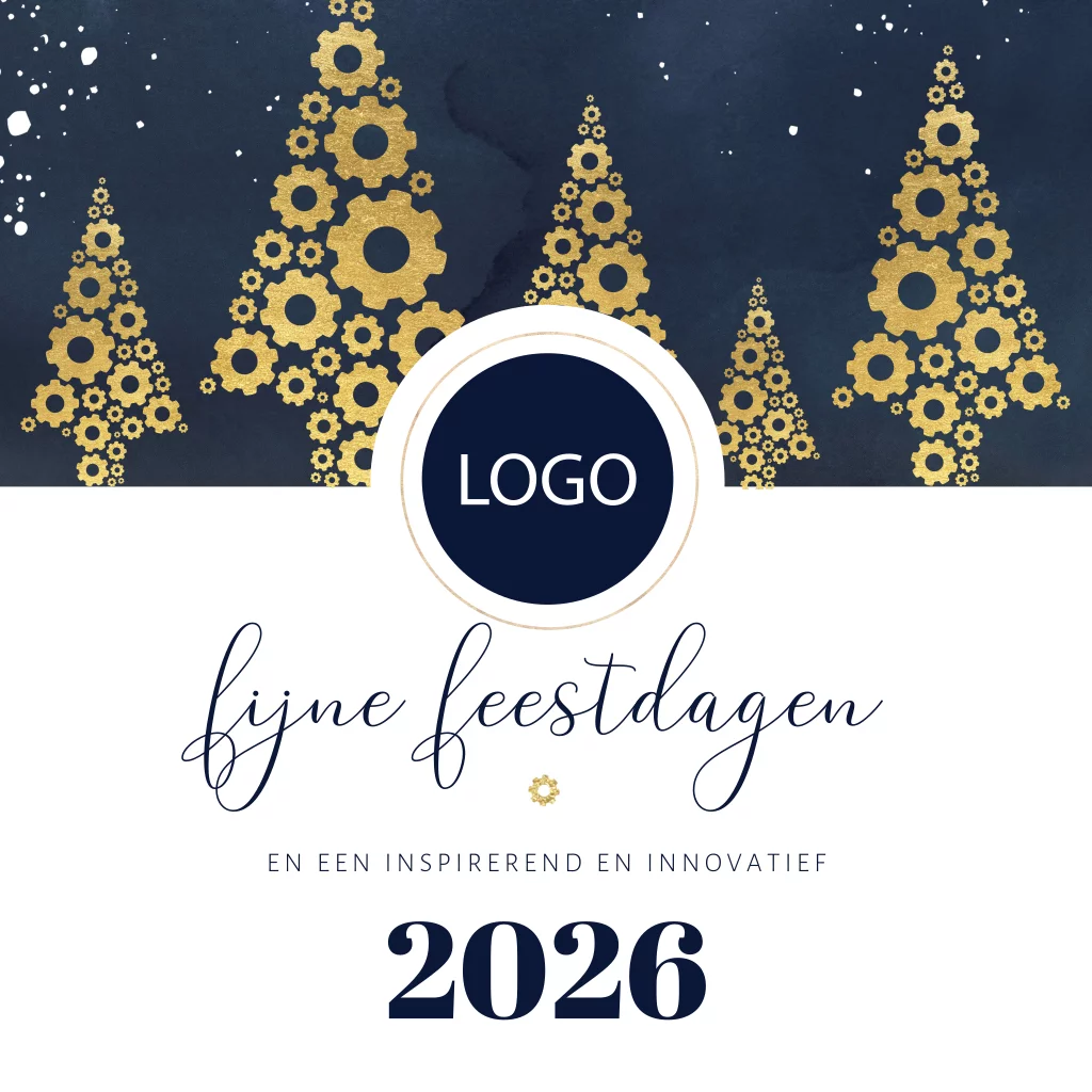 Zakelijke kerstkaart voor bedrijven in de technische sector met goudkleurige kerstbomen in de vorm van tandwieltjes. Op deze kaart is het mogelijk om op de voorzijde een eigen bedrijfslogo toe te voegen. Hulp nodig bij het aanpassen van deze kaart? We helpen je graag!