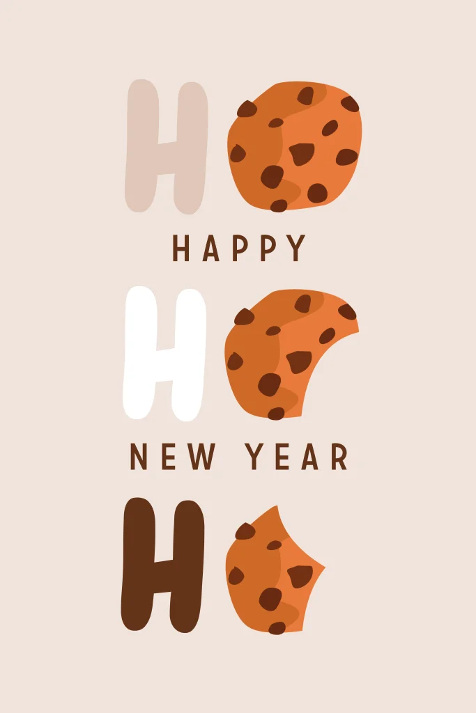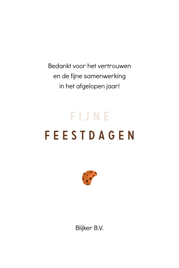 Ho Ho Ho, Merry Christmas and a Happy New Year! Wens je medewerkers, klanten en zakelijke relaties fijne feestdagen met deze hippe zakelijke kerstkaart in trendy kleuren. De chocoladekoekjes geven een grappige twist aan deze rustige kerstkaart.