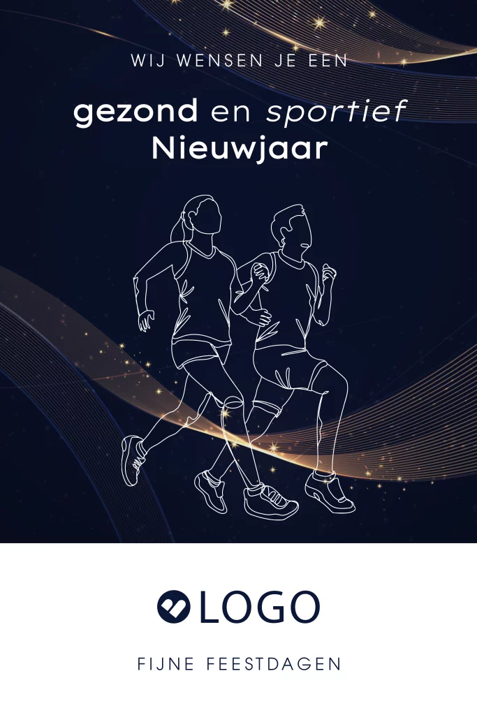 Zakelijke kerstkaart met een lijntekening van hardlopers om je medewerkers of klanten fijne feestdagen toe te wensen. Op deze kaart staat de tekst 'Wij wensen je een gezond en sportief nieuwjaar'. Voeg een eigen bedrijfslogo toe voor de persoonlijke touch. Pas naar eigen wens aan in de editor.