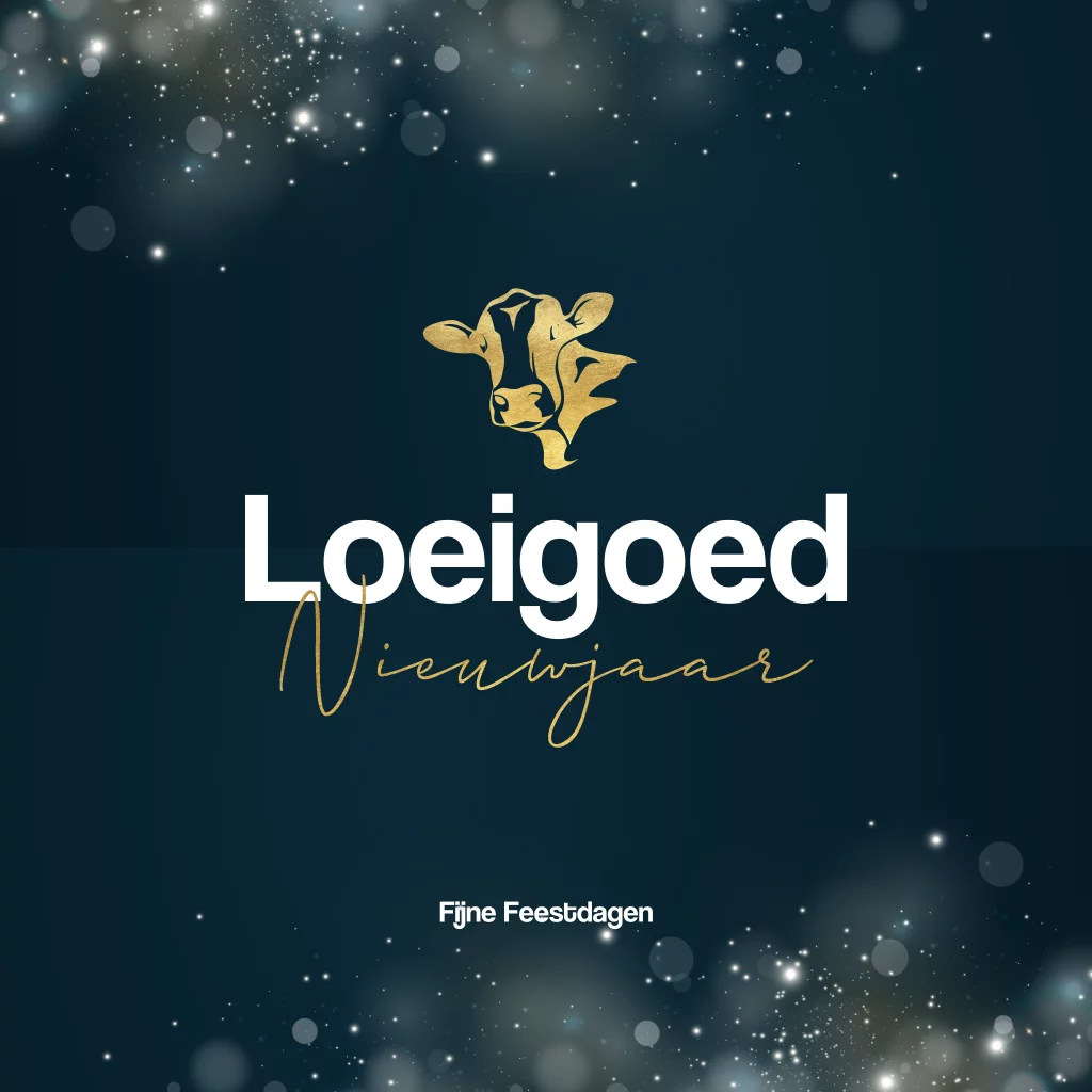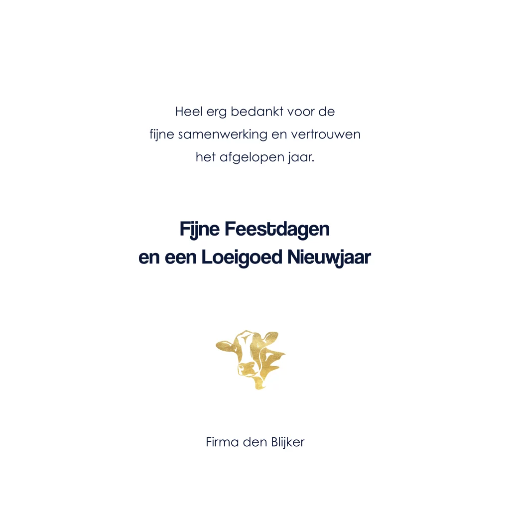 Agrarische zakelijke kerstkaart met een mooie donkerblauwe achtergrond. Op deze kaart de toepasselijke tekst 'Loeigoed Nieuwjaar' met daarboven een goudkleurig silhouet van een koe. Helemaal geschikt voor bijvoorbeeld een melkveebedrijf of boerderij winkel. Pas de kaart naar je eigen smaak aan in de editor en combineer met een mooie envelop om het helemaal af te maken.
