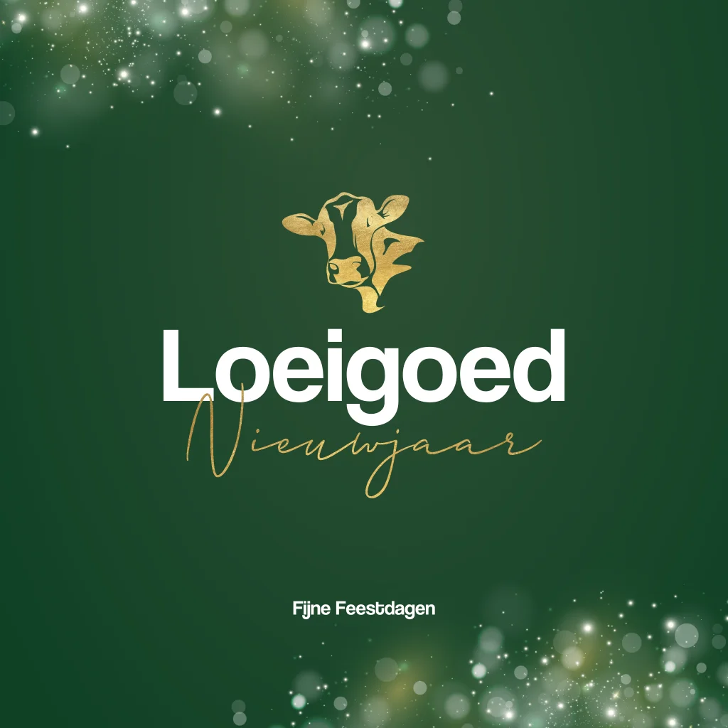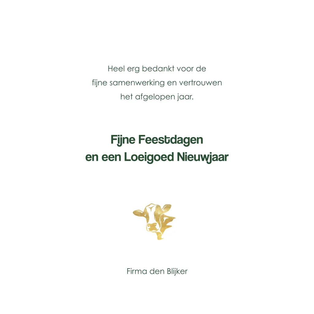 Vier de feestdagen in stijl met onze prachtige agrarische zakelijke kerstkaart "Loeigoed Nieuwjaar". Boven deze toepasselijke tekst staat een goudkleurig silhouet van een koe. Deze kaart is zeker geschikt voor bijvoorbeeld een melkveebedrijf of boerderijwinkel. Pas de kaart naar je eigen smaak aan in de online editor en voeg je eigen bedrijfslogo toe aan de binnenkant van deze kaart voor een persoonlijke touch. Hulp nodig? We helpen je graag!