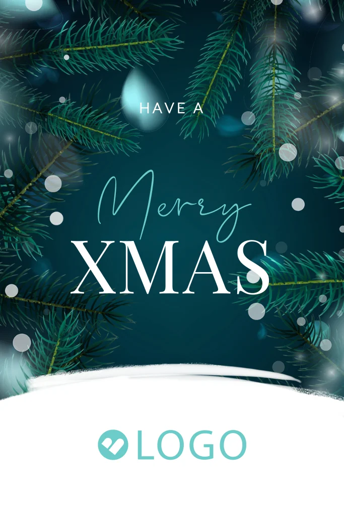 Zakelijke Merry Christmas kerstkaart. Deze kaart heeft een stijlvolle uitstraling door de blauw groene tinten met Kerst dennentakken en sprankelende lichtjes. Geschikt voor bedrijven uit diverse sectoren en branches.