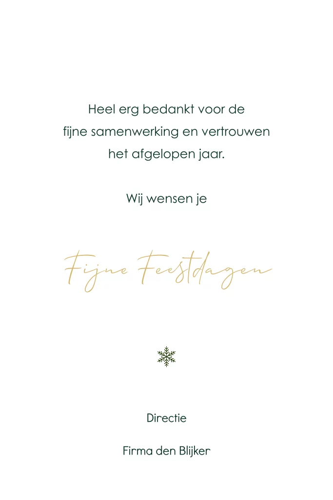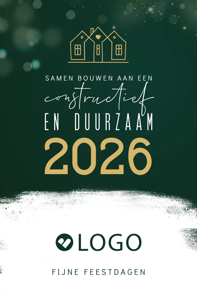 Mooie winterse zakelijke kerstkaart om je medewerkers of klanten fijne feestdagen toe te wensen. Op deze kaart staat het jaartal 2026 op een speelse manier en is het mogelijk om op de voorzijde je eigen bedrijfslogo toe te voegen. Deze kaart heeft een donkergroene achtergrondkleur met huisjes op de voorkant. De tekst "samen bouwen aan een constructief en duurzaam 2026" maakt deze kaart geschikt voor makelaars, bouwbedrijven of bedrijven in constructie. Pas deze kerstkaart naar eigen wens aan in onze online editor.
