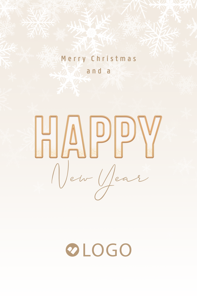 Zakelijke Kerstkaart met ronde hoeken met de tekst 'Merry Christmas and a Happy New Year' in goudlook. Deze kaart heeft een stijlvolle rustige uitstraling door de zachte beige tinten met witte sneeuw ijskristallen. Geschikt voor bedrijven uit diverse sectoren en branches. De afbeelding van het logo dient als voorbeeld en wordt niet gedrukt. Deze kun je verwijderen of plaats hier je eigen logo overheen.