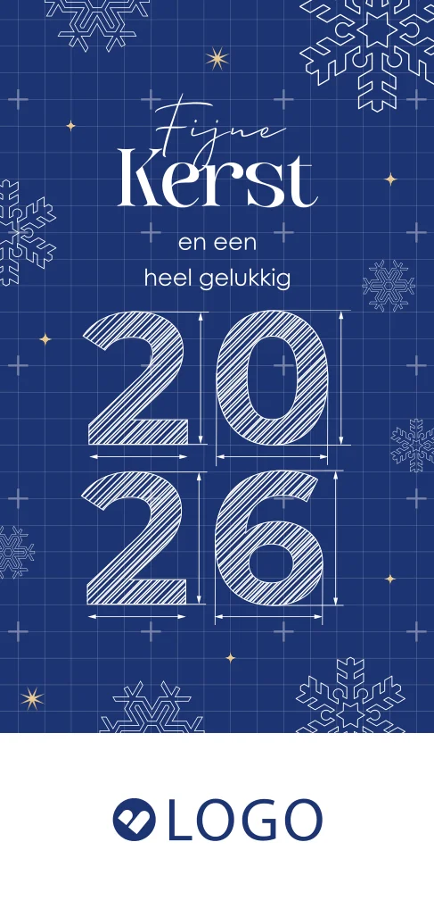 Wens je medewerkers en zakelijke relaties een fijne Kerst en een heel gelukkig 2026 met deze zakelijke kerstkaart. Geschikt voor bedrijven in de bouwsector. Op de kaart zie je een bouwtekening van het jaartal 2026 met op de achtergrond ijskristallen. Daarnaast is deze kerstkaart heel geschikt voor bouwbedrijven, klusbedrijf, maakindustrie of bedrijven in constructie. Voeg je eigen logo toe om de kaart extra persoonlijk te maken. De afbeelding van het logo dient als voorbeeld en wordt niet gedrukt. Deze kun je verwijderen of plaats hier je eigen logo overheen.