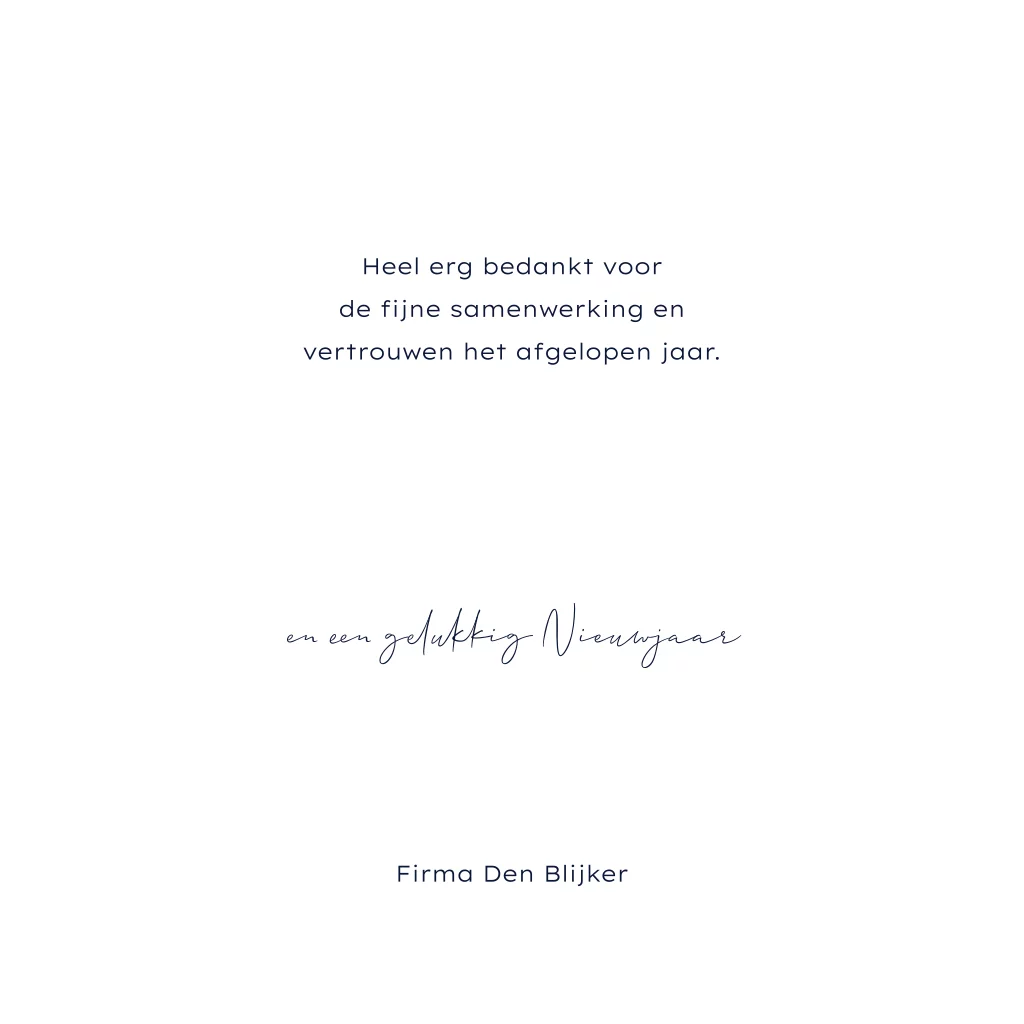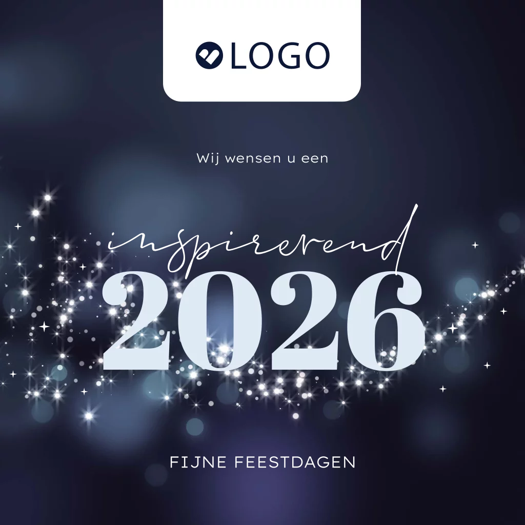 Stijlvolle zakelijke kerstkaart met sparkles en goudfolie. Wens met deze zakelijke kaart al je zakelijke relaties een inspirerend 2026 en fijne feestdagen. Op de blauwe achtergrond komen de witte sparkles en goudfolie mooi naar voren. De afbeelding van het logo dient als voorbeeld en wordt niet gedrukt. Deze kun je verwijderen of plaats hier je eigen logo overheen.