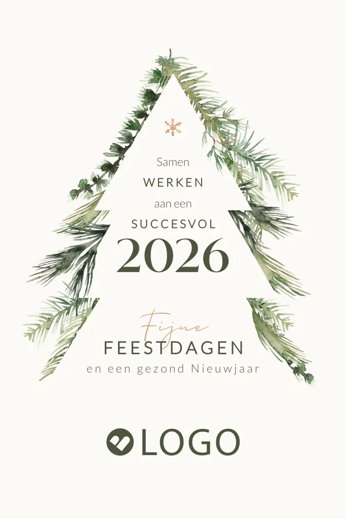 Een prachtige zakelijke kerstkaart met geïllustreerde dennentakken en een kader van een kerstboom. Deze kaart heeft afgeronde hoeken wat zorgt voor een speels effect. Op deze kaart staat de tekst 'Samen werken aan een succesvol 2026' en 'Fijne feestdagen en een gezond Nieuwjaar'. Plaats je eigen bedrijfslogo in onze online editor op de voorzijde van deze kaart voor een persoonlijke touch. Wens met deze zakelijke kerstkaart je medewerkers en zakelijke relaties fijne kerstdagen toe!