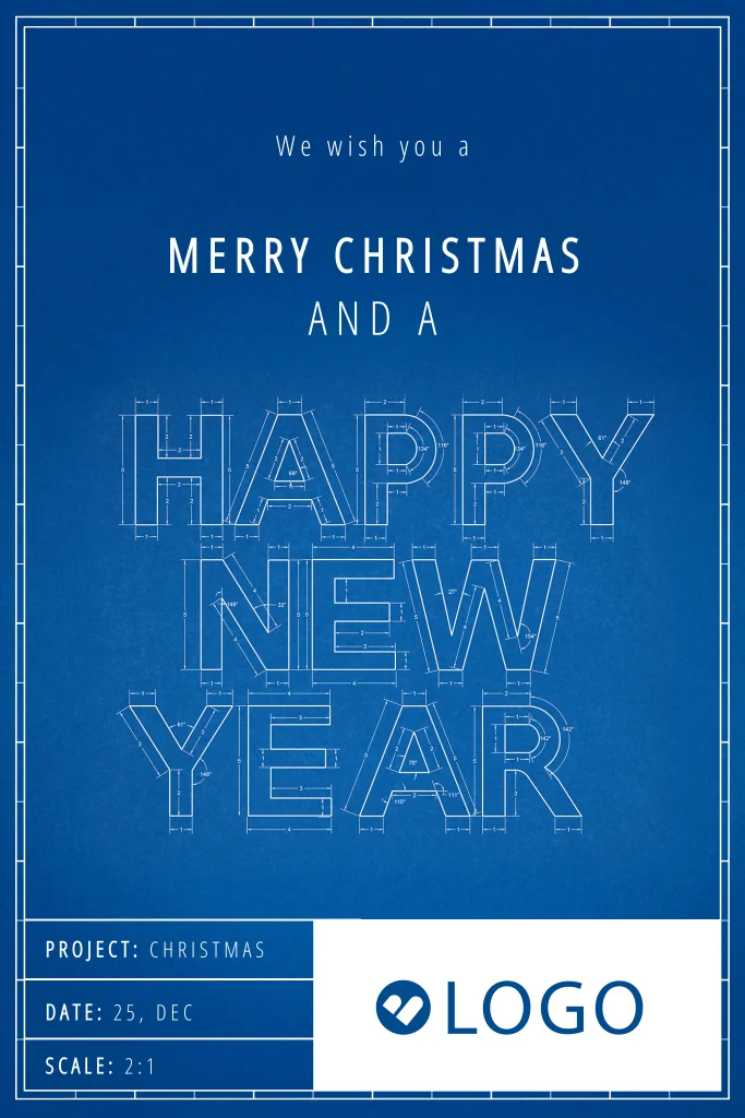 Heb je een bedrijf in de bouwbranche en zoek je een originele kerst of nieuwjaarskaart? Deze zakelijke kerstkaart met blueprint bouwtekening is daar perfect voor! Wens met deze zakelijke nieuwjaarskaart al je zakelijke relaties fijne feestdagen. Personaliseer de kaart met een eigen bedrijfslogo. De afbeelding van het logo dient als voorbeeld en wordt niet gedrukt. Deze kun je verwijderen of plaats hier je eigen logo overheen.