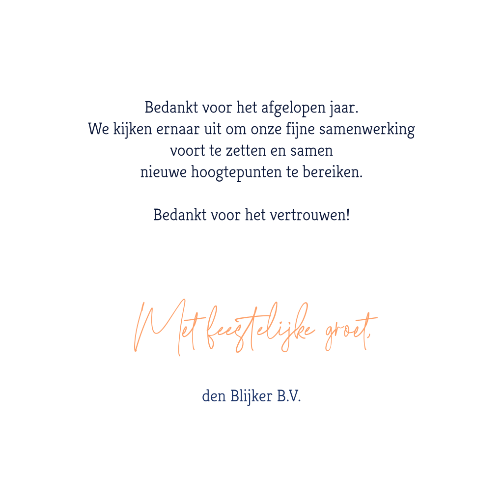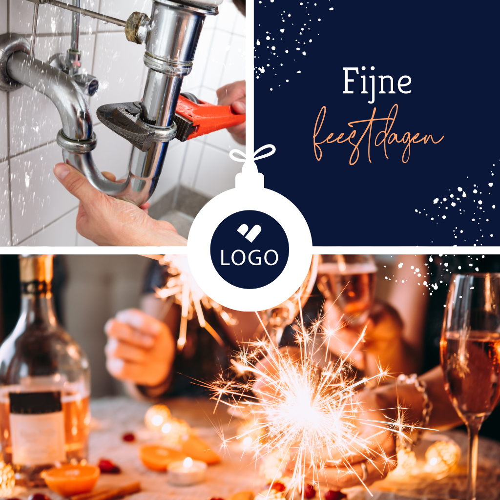 Wens al je zakelijke relaties fijne feestdagen met deze zakelijke kerstkaart met vlakverdeling. Op de foto's een installateur die met een kraan bezig is en een feestelijke nieuwjaarsfoto met champagne en sterretjes. De foto's zijn eventueel naar wens aan te passen maar de gebruikte foto's geven een prima kerstgevoel voor met name de installatietechniek branche. Op de voorkant is er ruimte voor het logo van je eigen bedrijf. Het ontwerpteam van Blijkaartje helpt je graag met het aanpassen van deze kaart.
