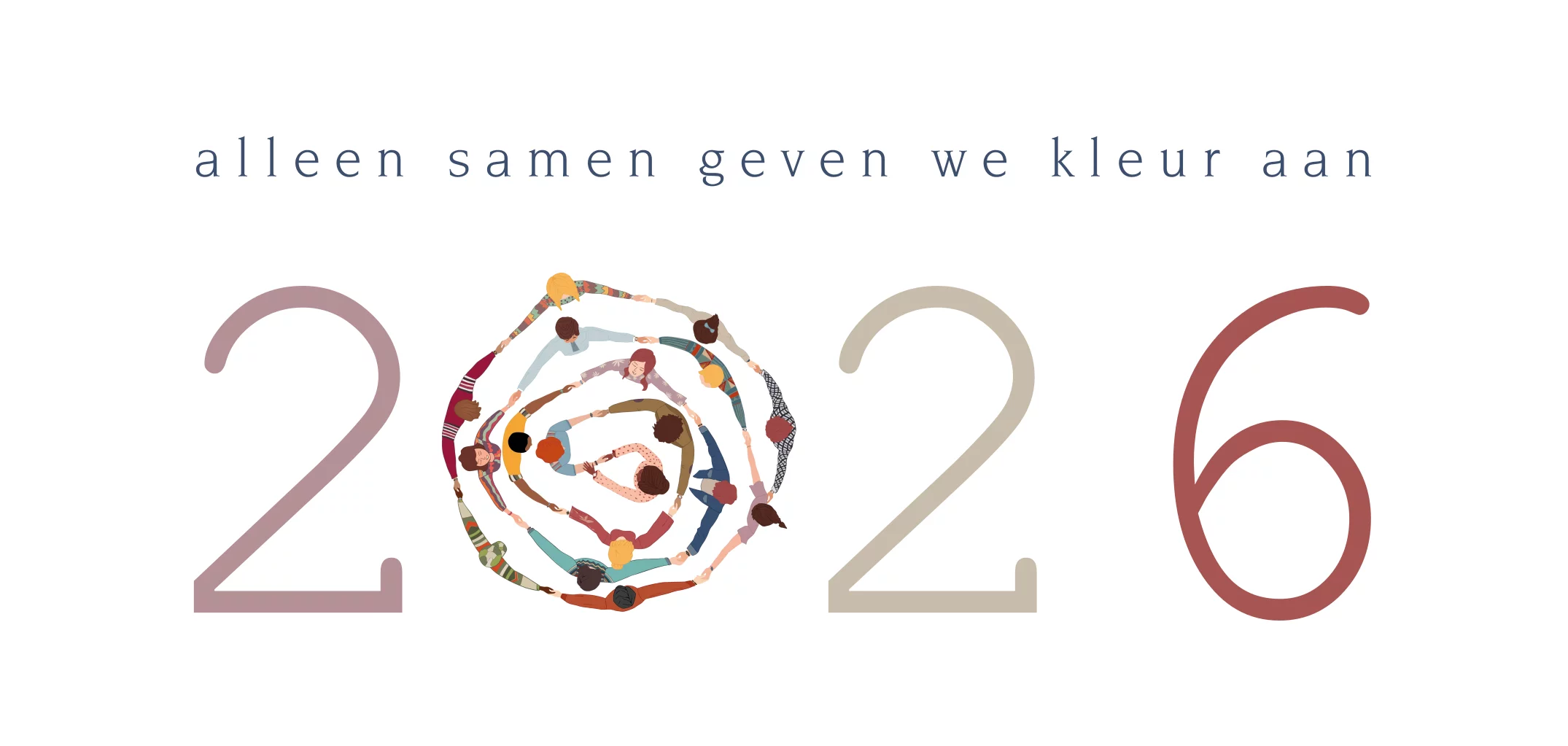 Geef samen kleur aan 2026 met deze zakelijke kerstkaart. Deze kaart straalt saamhorigheid uit door de kring van mensen met verschillende culturen in het jaartal 2026. Geschikt voor verschillende branches en sectoren zoals een bedrijf of instelling in de zorg, bouw, of facilitaire dienstverlening.
