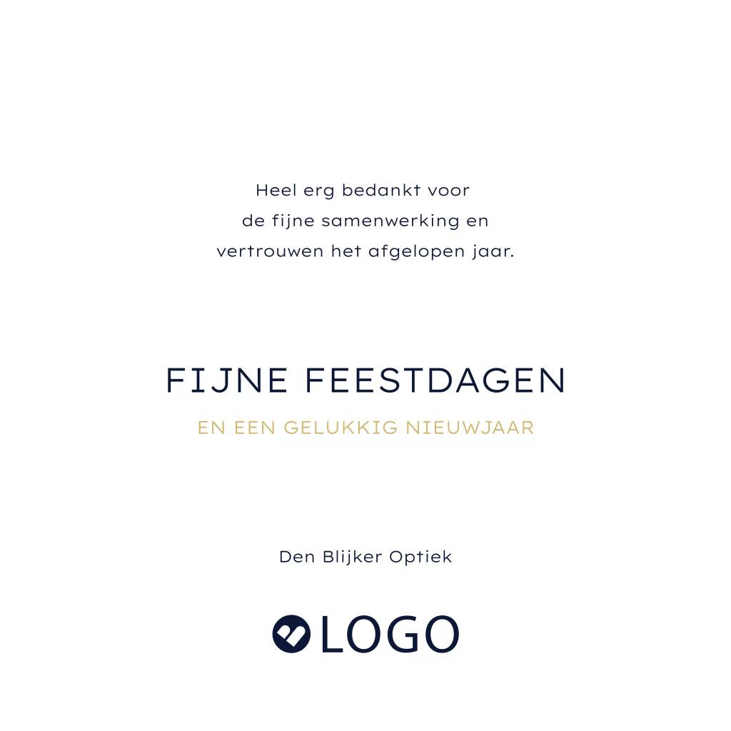Wens met deze zakelijke nieuwjaarskaart al je zakelijke relaties een briljant 2026. De blauwe achtergrond met wit gouden details zorgen ervoor dat de kaart er chic uitziet. Deze kaart is perfecte voor bedrijven uit de zorg- en caresector zoals een opticien. Op de kaart staat namelijk een gouden bril. De kaart heeft verder aan de rechterzijde afgeronde hoeken. Aan de binnenkant is er nog ruimte voor jullie eigen bedrijfslogo.