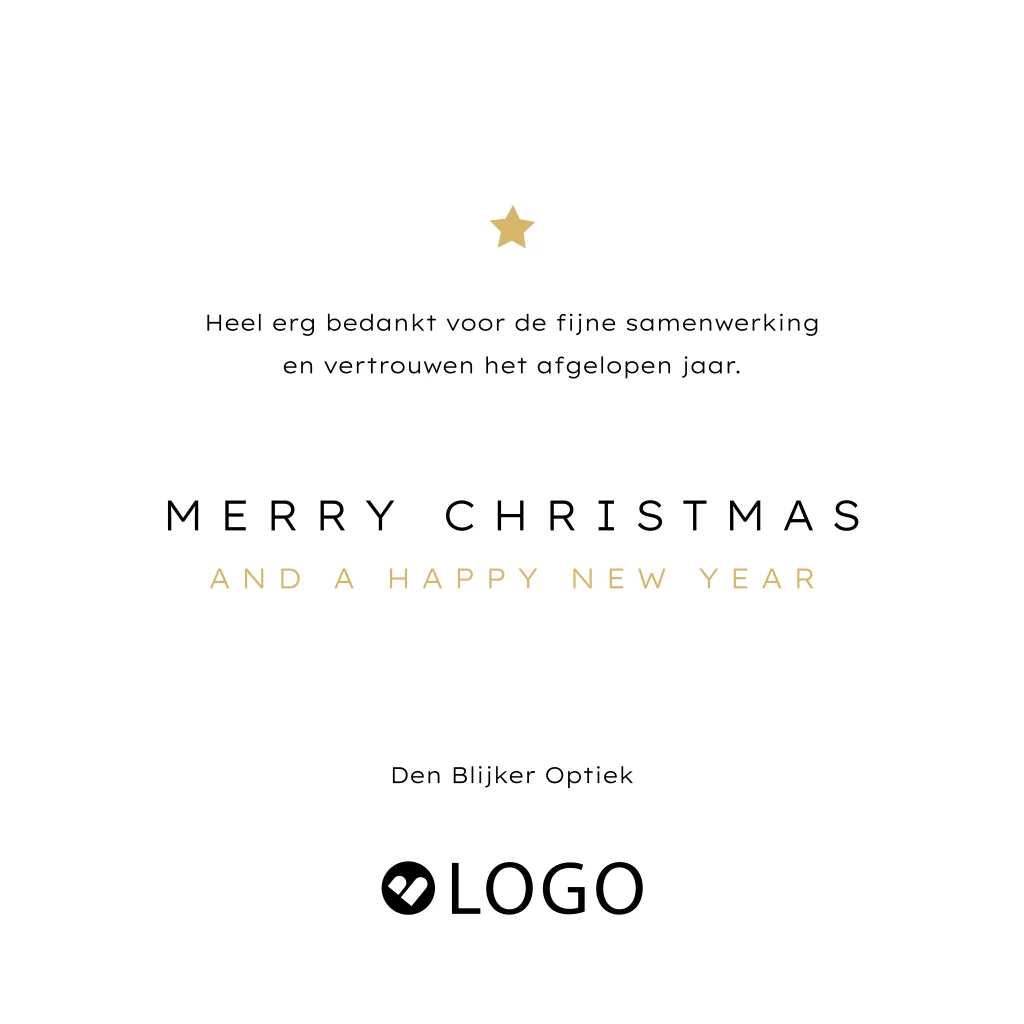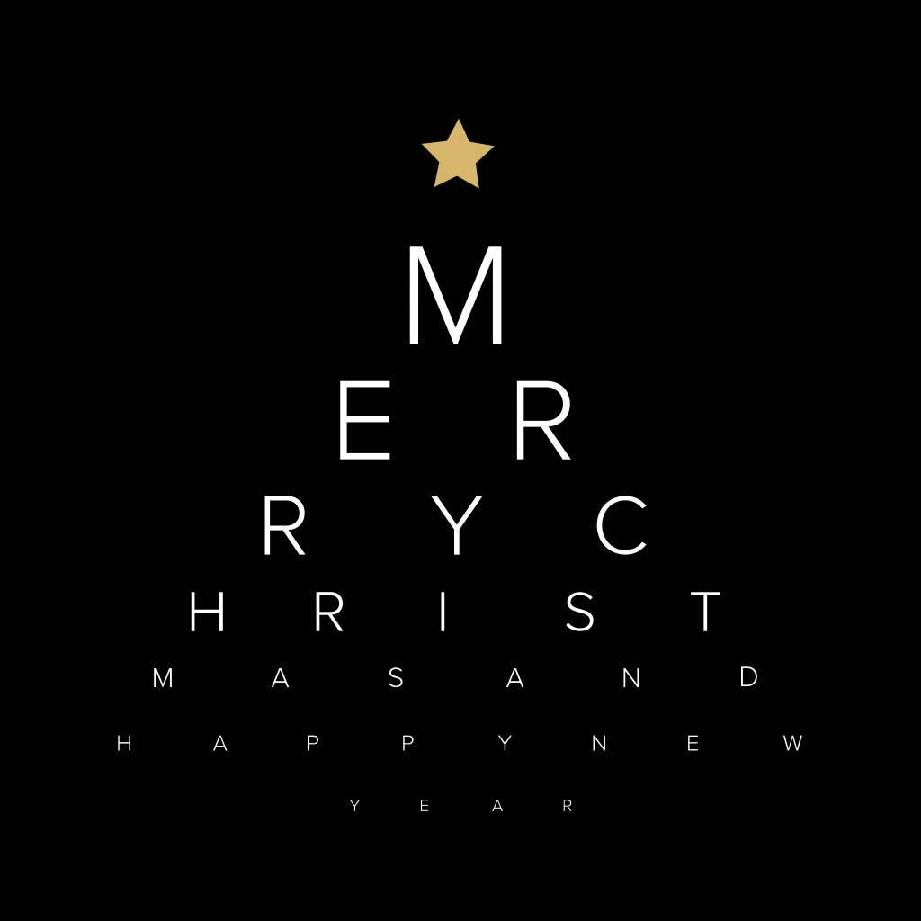 Strakke zakelijke kerstkaart met de tekst Merry Christmas and Happy New Year in de vorm van een kerstboom met een ster. Deze kerstkaart past helemaal bij een opticien doordat de tekst wordt afgebeeld zoals bij een oogtest. Een leuke knipoog naar je eigen werkgebied. Aan de binnenkant is er nog ruimte voor jullie eigen bedrijfslogo.